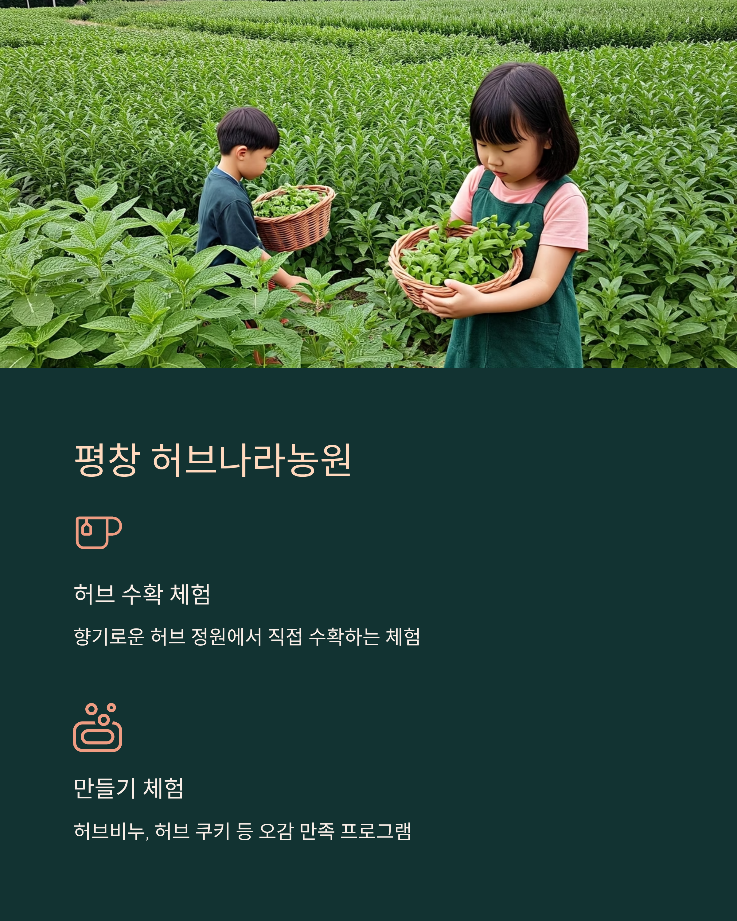 향기로운 허브 정원과 직접 허브를 수확해보는 체험이 준비되어 있습니다.