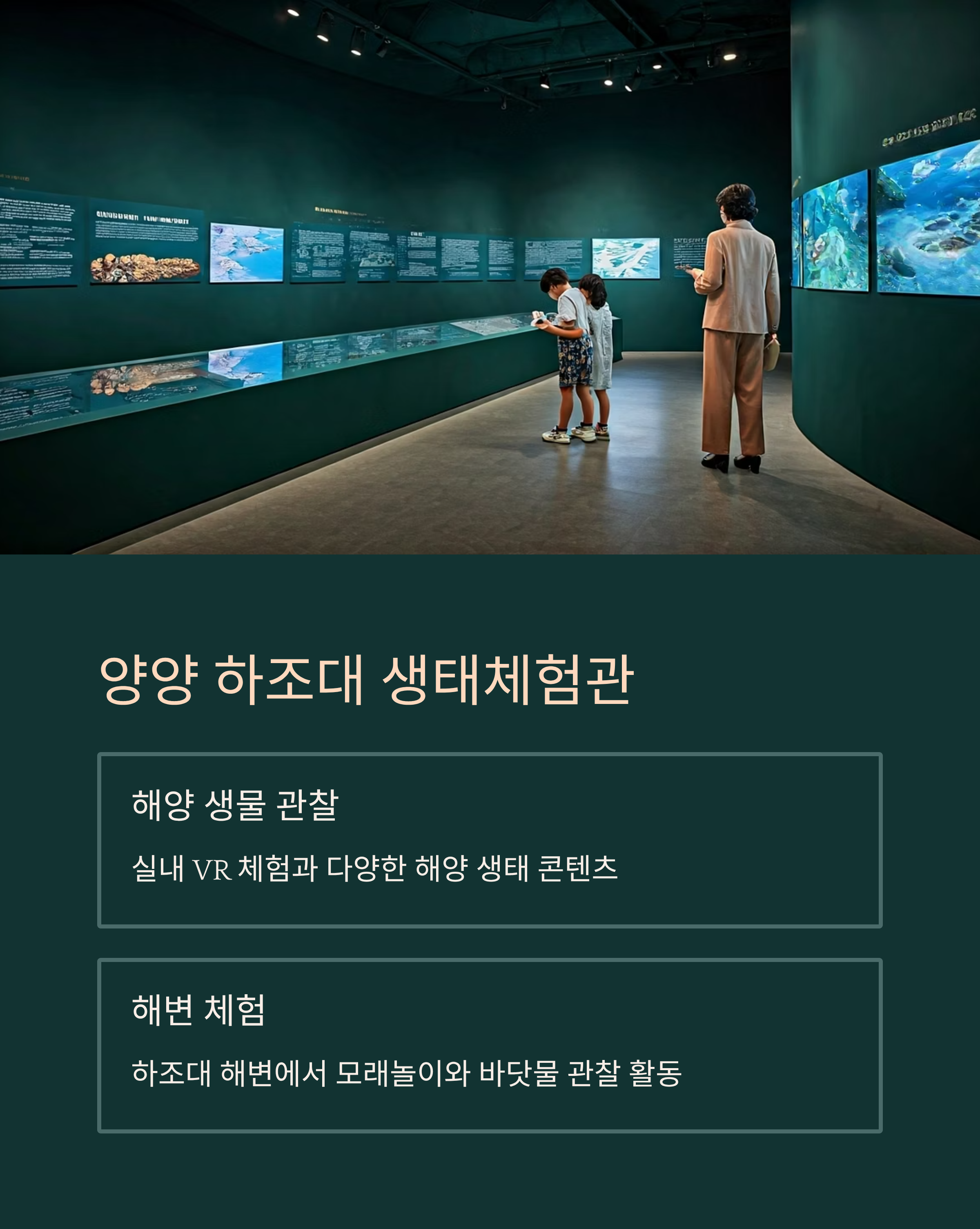 체험관 내부에서는 해양 생물 관찰, 실내 VR 체험 등 다양한 콘텐츠가 마련되어 있고,