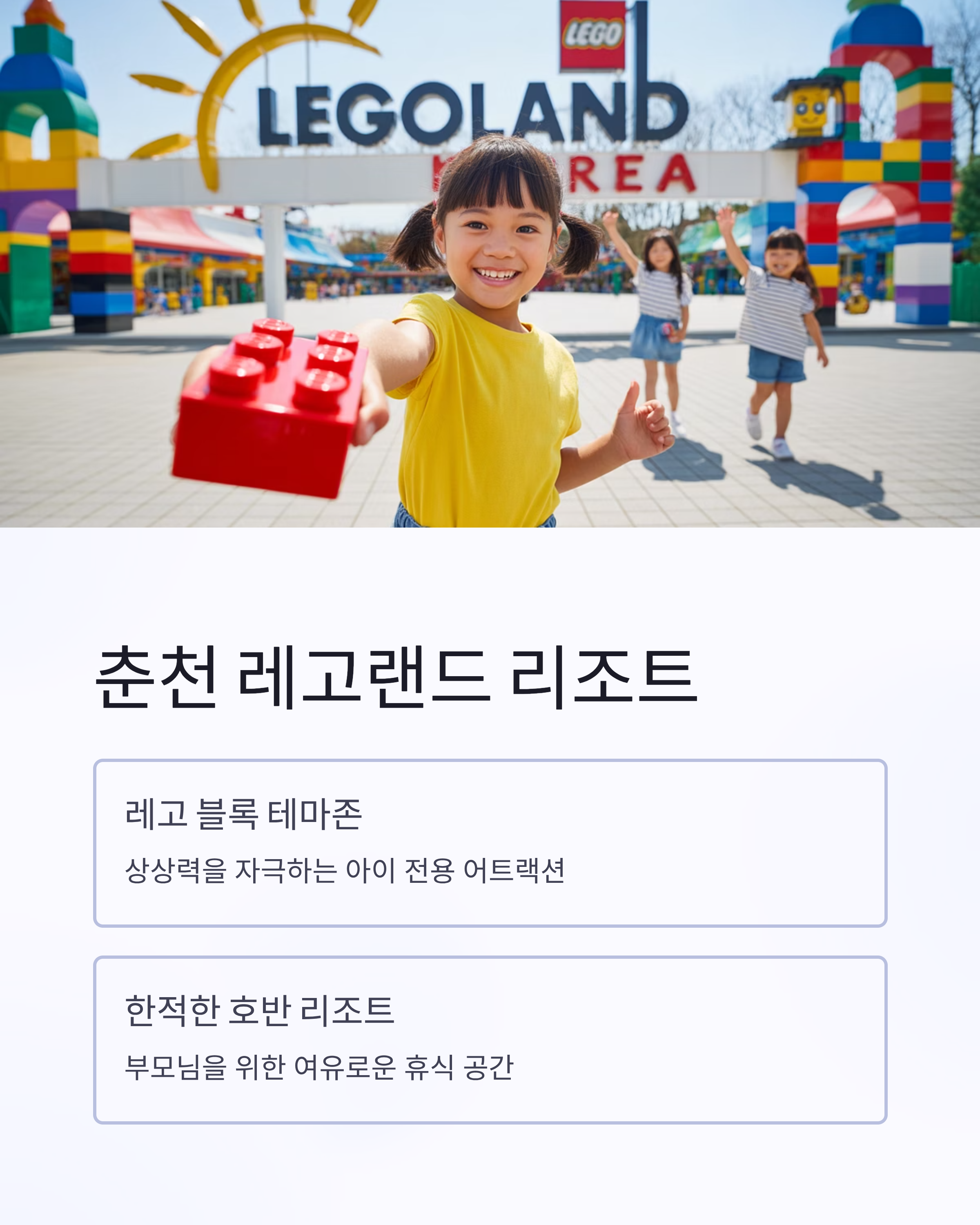 실제 레고 블록처럼 꾸며진 놀이기구와 테마존은 상상력을 자극하고,