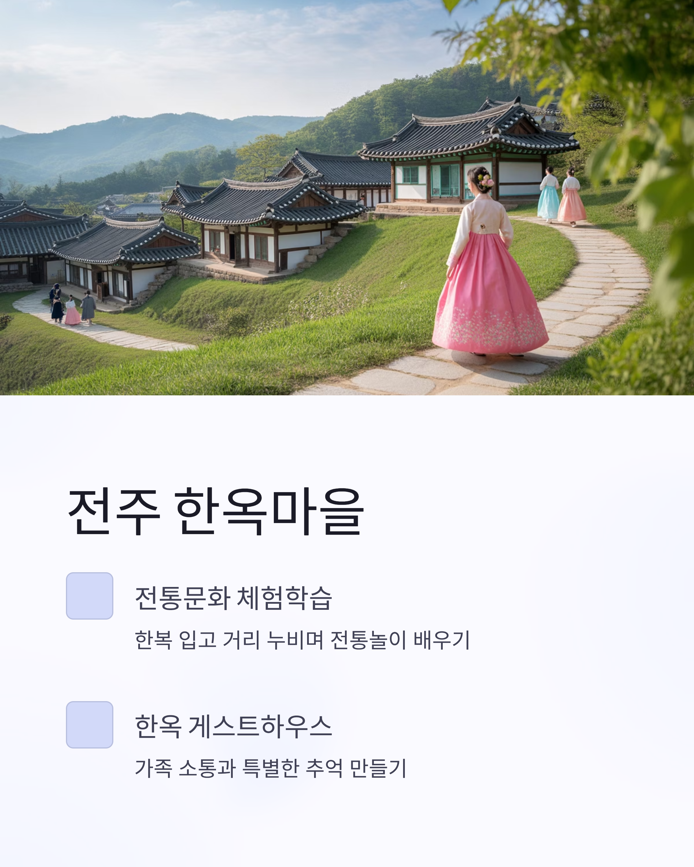 | 전주 한옥마을 | 제한적 | 전통 체험 힐링 |