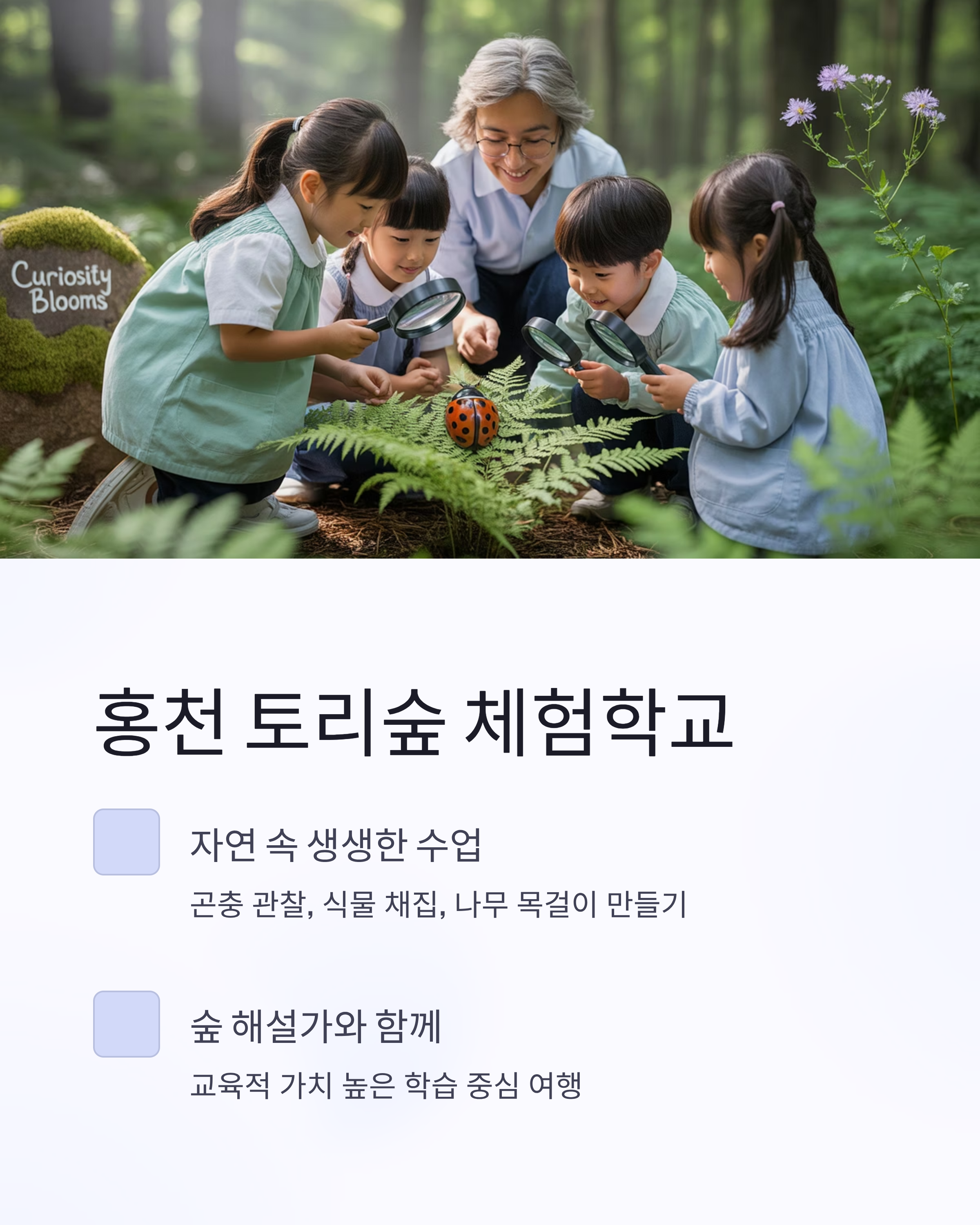다채로운 자연 체험이 준비되어 있습니다. 숲 해설가가 함께하며 교육적 가치도