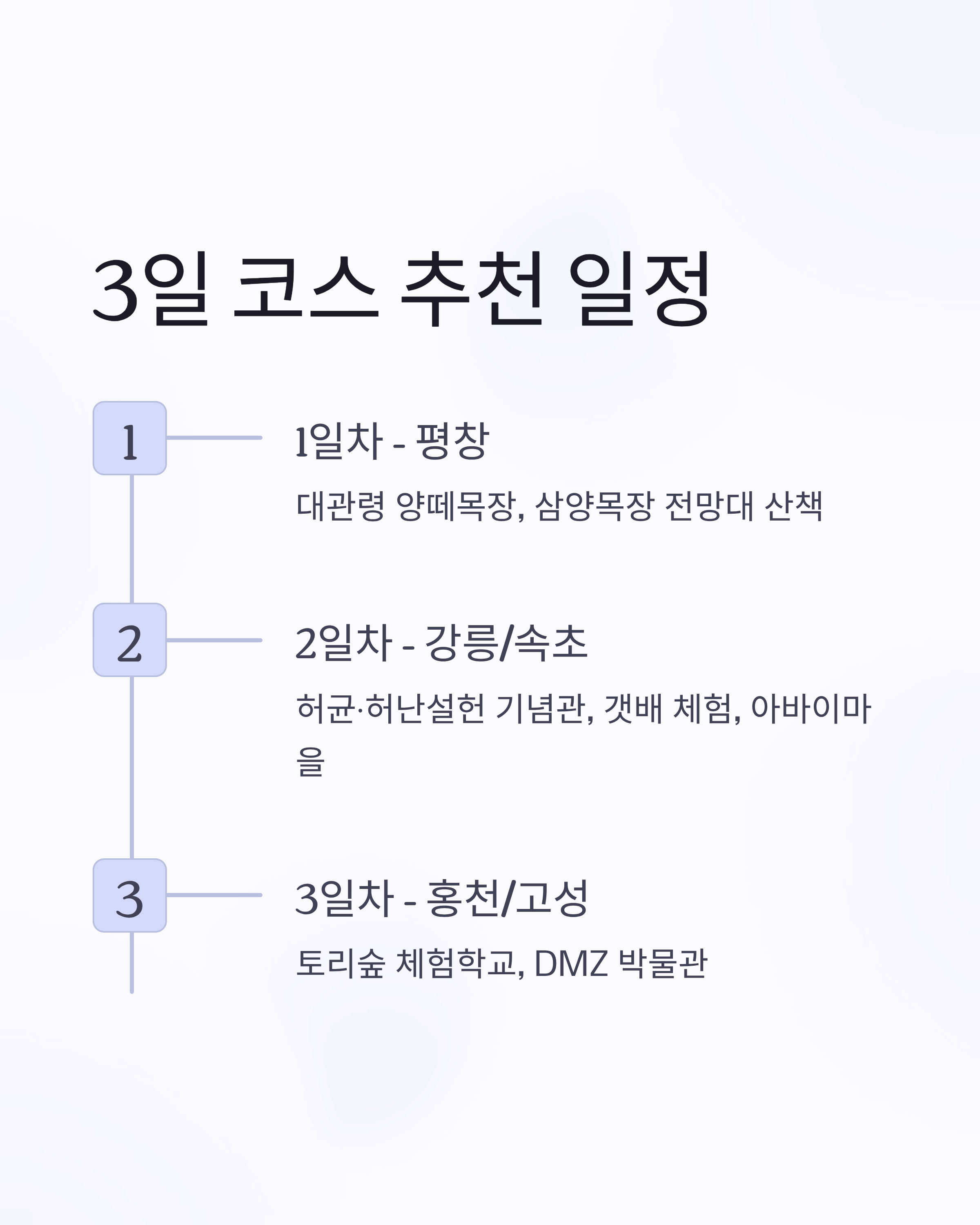 | 3일차 | 홍천/고성 | 토리숲 체험학교, DMZ 박물관 |
