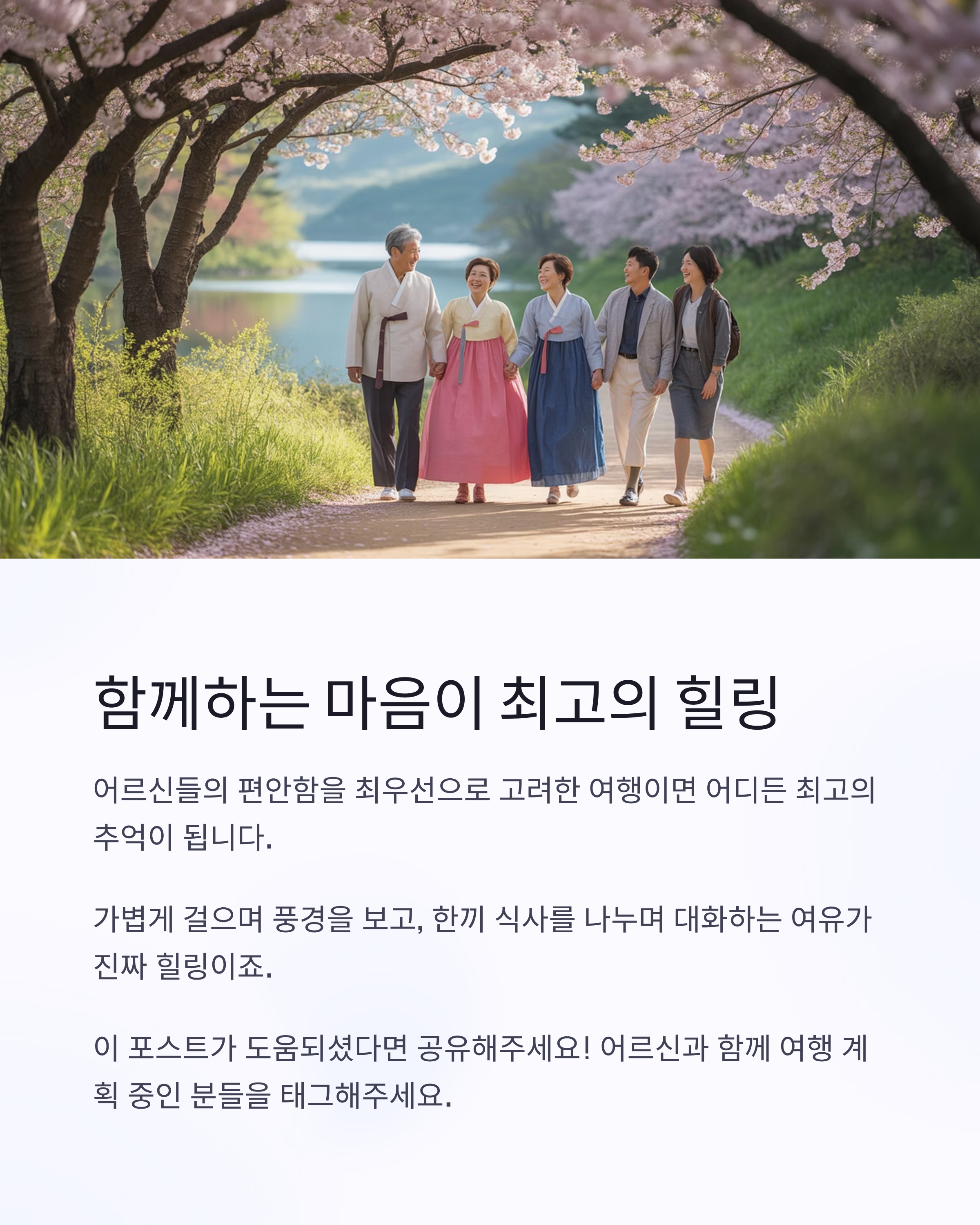 연세 많은 부모님이나 조부모님과의 여행, 어디로 가야 모두가 편하고 즐거울까요? 이 글에서는 어르신들의 체력과 취향을 고려한 국내 힐링 여행지를 소개합니다. 계절별 추천 코스부터 교통이 편리한 동선까지, 실속 있고 정서적 안정까지 챙길 수 있는 여행 경로를 확인해보세요.