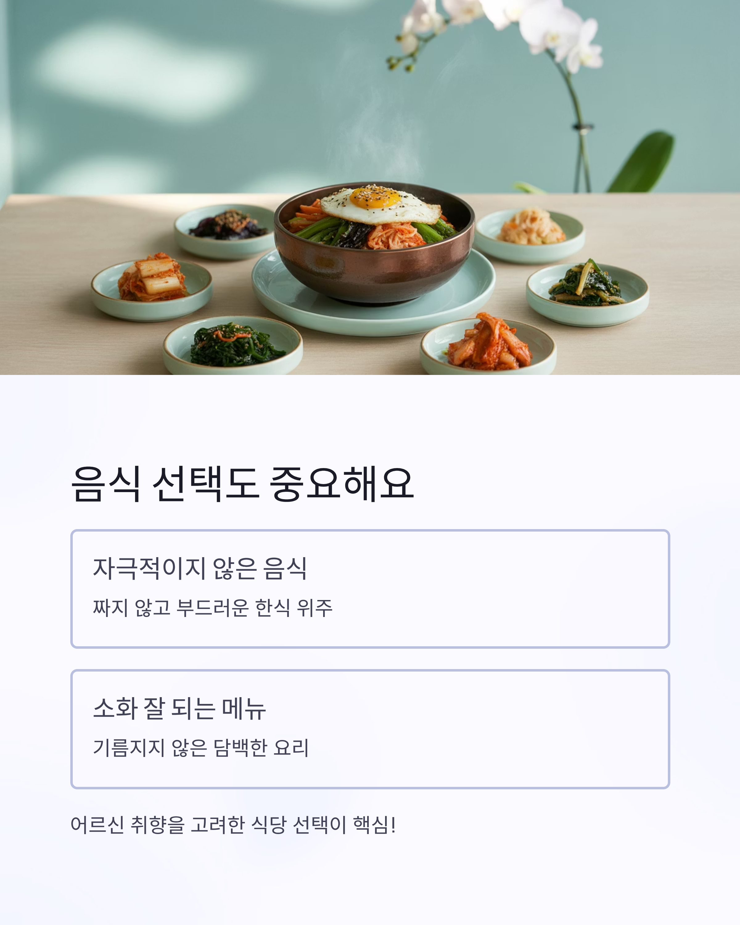 음식 취향 고려 짜지 않고 자극적이지 않은 식당 위주 선택