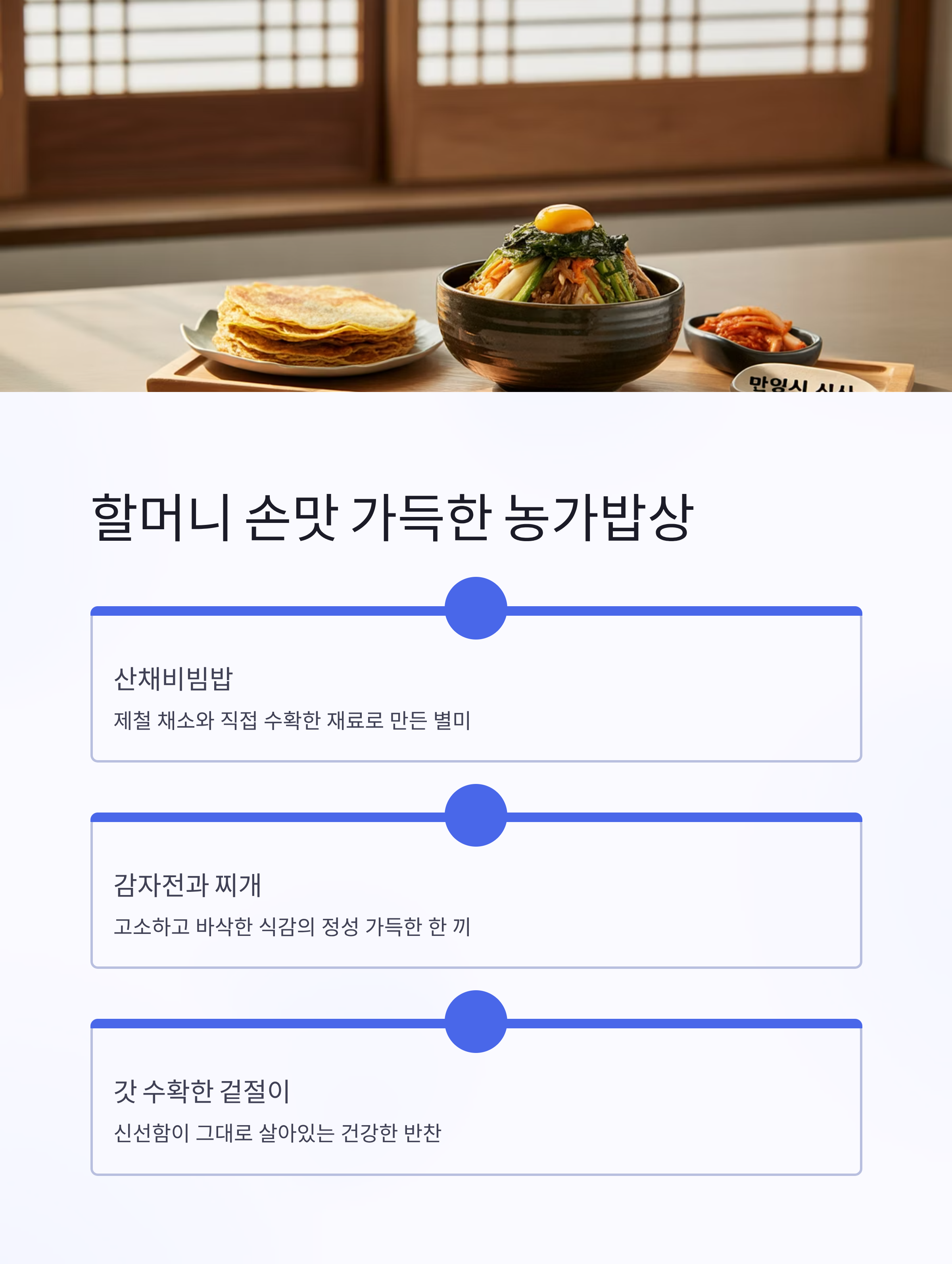 | 산채비빔밥 | 제철 채소, 직접 수확 재료 |