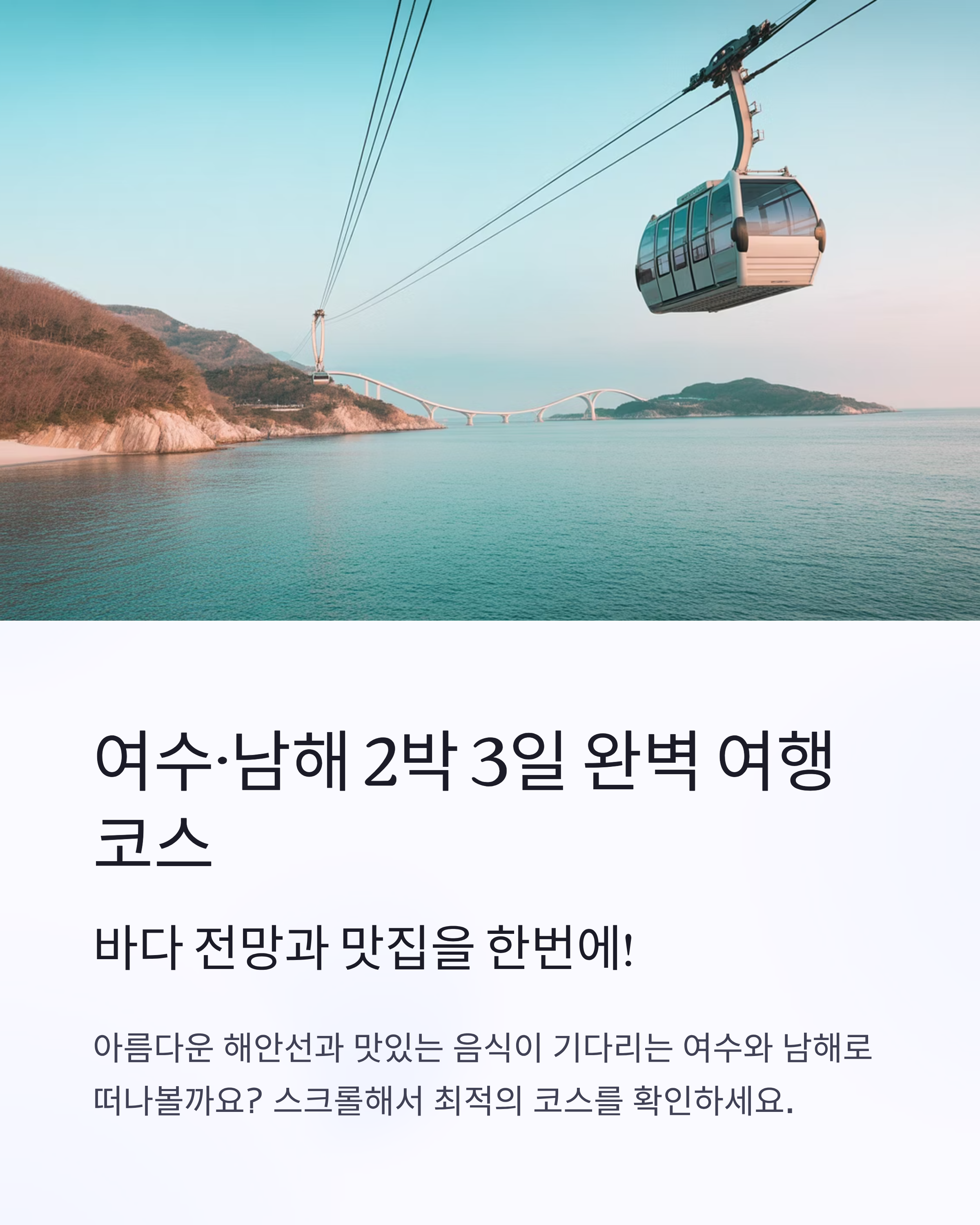 여수·남해는 드라이브 코스와 바다 전망이 아름다워서 2박 3일 일정이면 여유롭게 즐기실 수 있습니다.