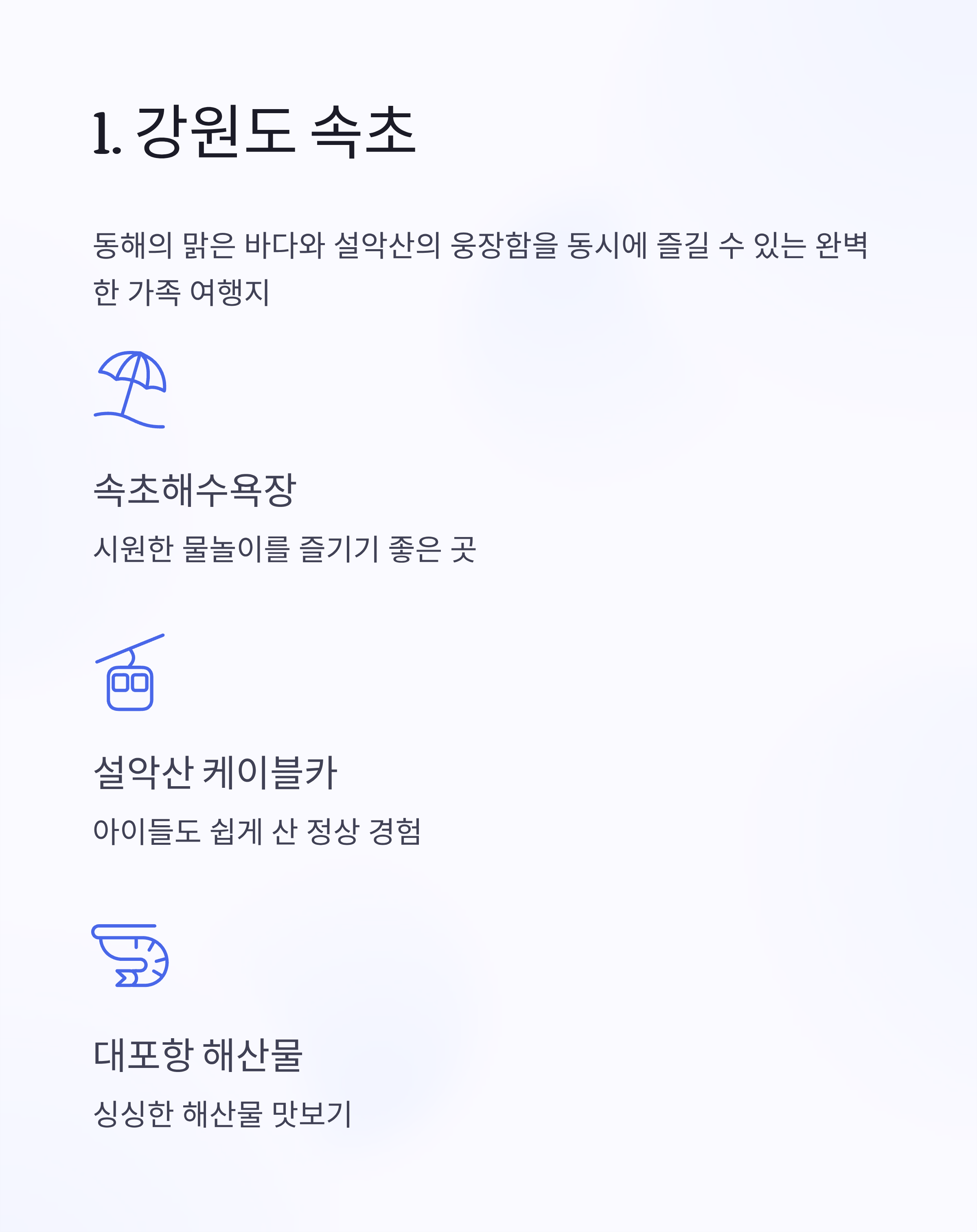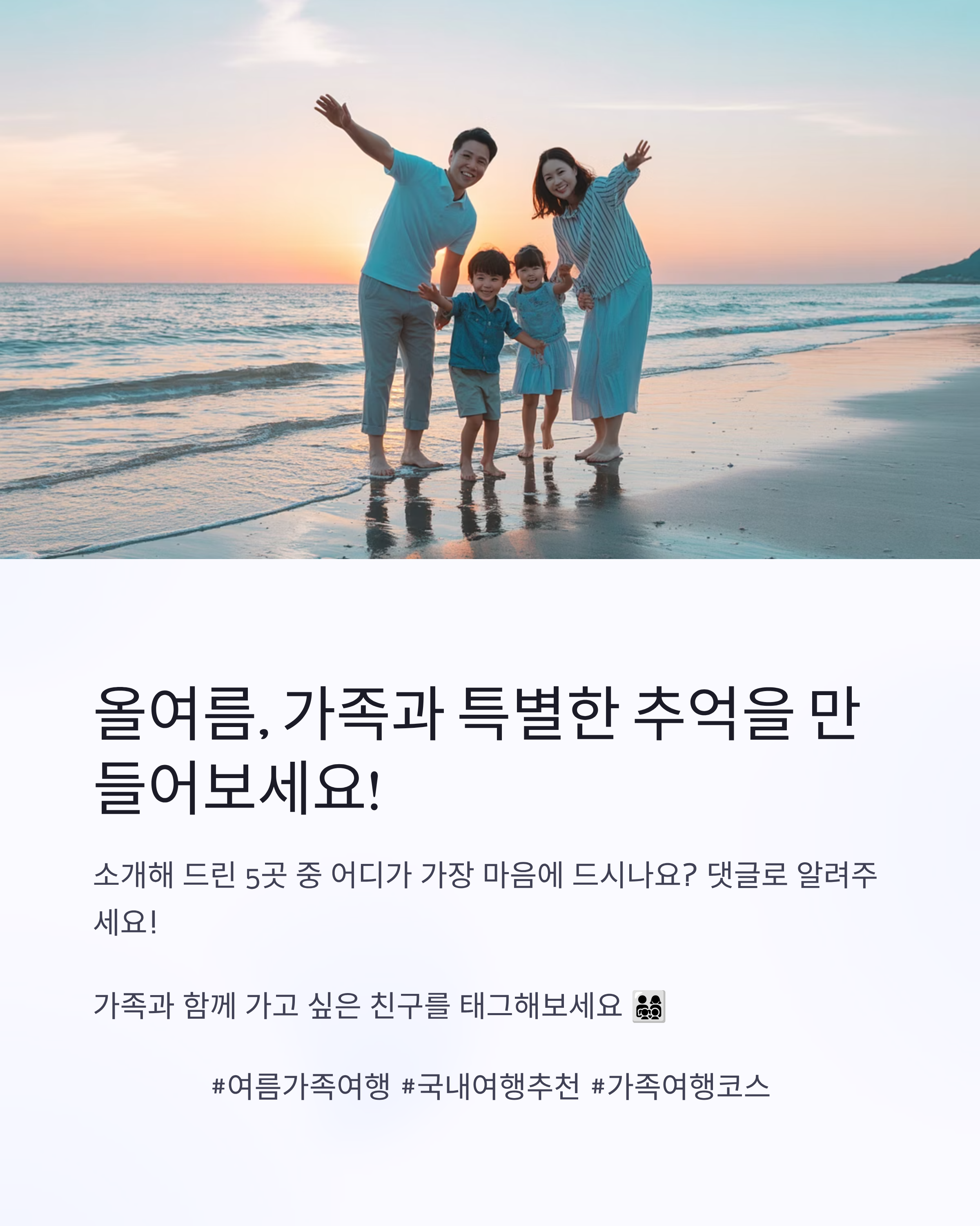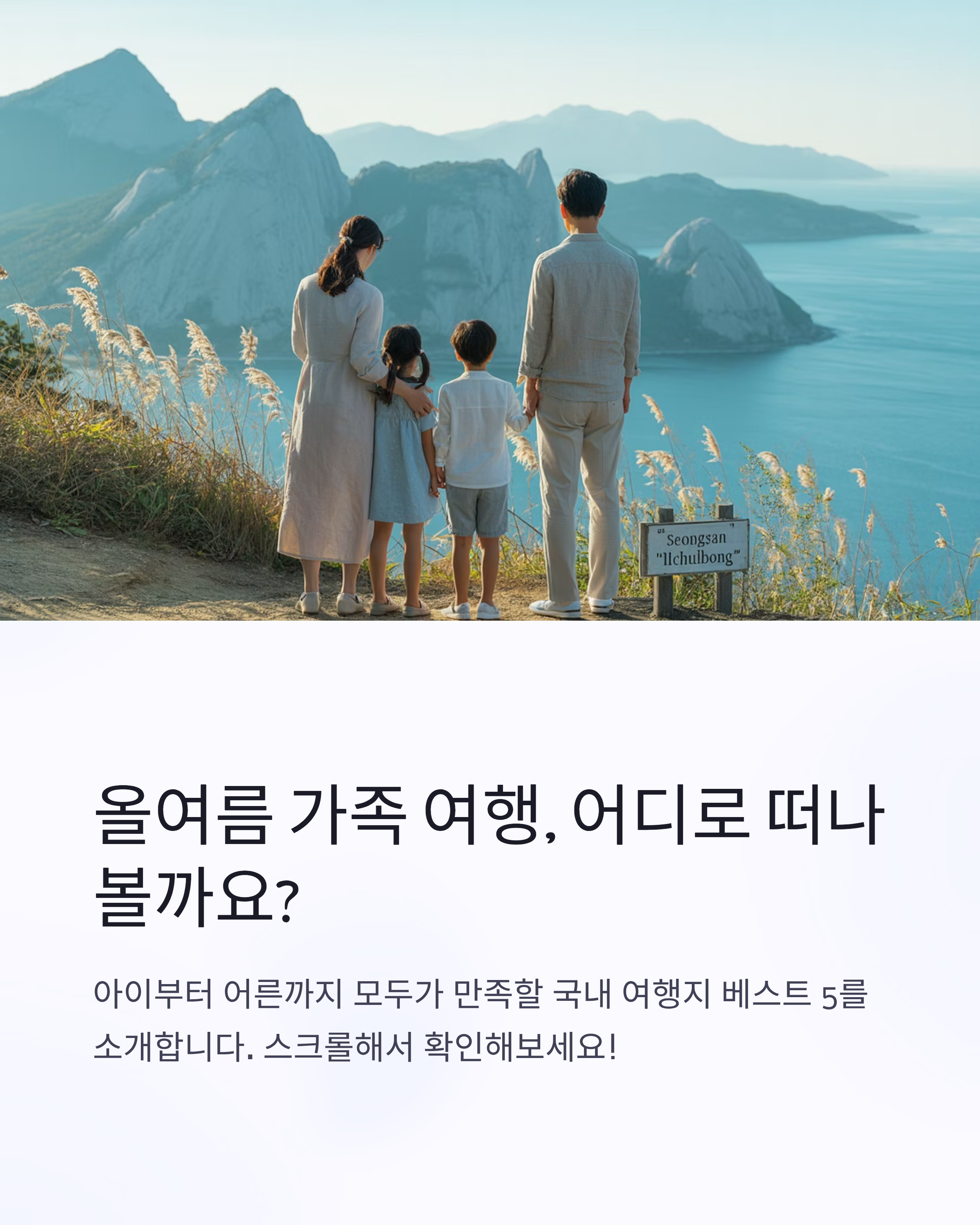 올여름, 가족과 함께 특별한 추억을 만들고 싶다면 지금 소개하는 국내 인기 가족 여행지를 주목해보세요. 자연과 체험, 즐길 거리가 모두 어우러진 이곳들은 아이부터 어른까지 모두가 만족할 만한 코스들입니다. 도심 근교는 물론, 색다른 분위기를 느낄 수 있는 섬과 산, 해변까지 골고루 포함되어 있어 선택의 폭도 넓습니다.