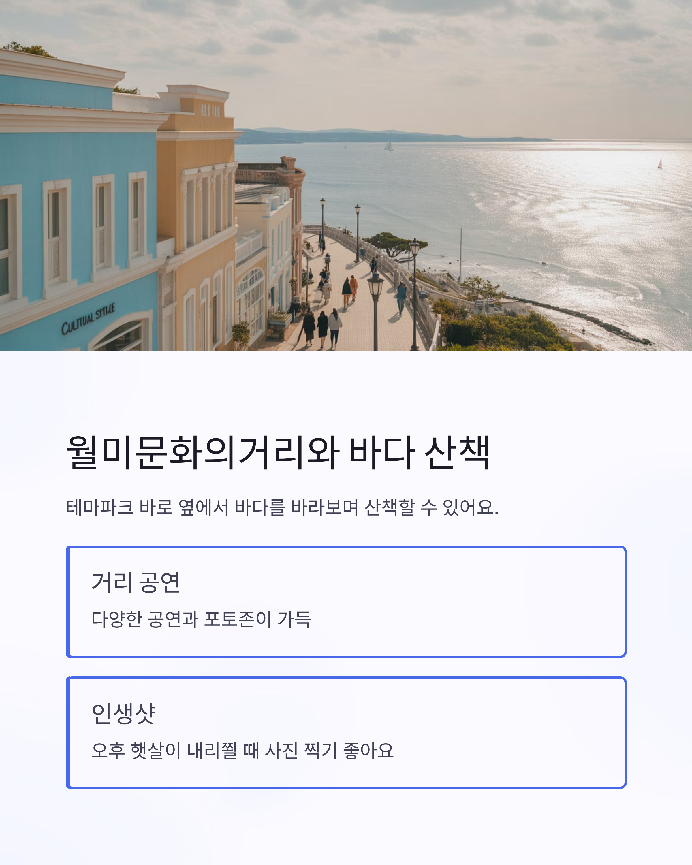 통창으로 바다를 감상할 수 있는 곳, 루프탑이 있는 감성 카페, 커피 맛이 뛰어난 로스터리 카페 등 취향에 따라 선택하면 됩니다. 테마파크의 흥분과 바다의 평화를 모두 담은 하루를 여유롭게 마무리할 수 있어요.