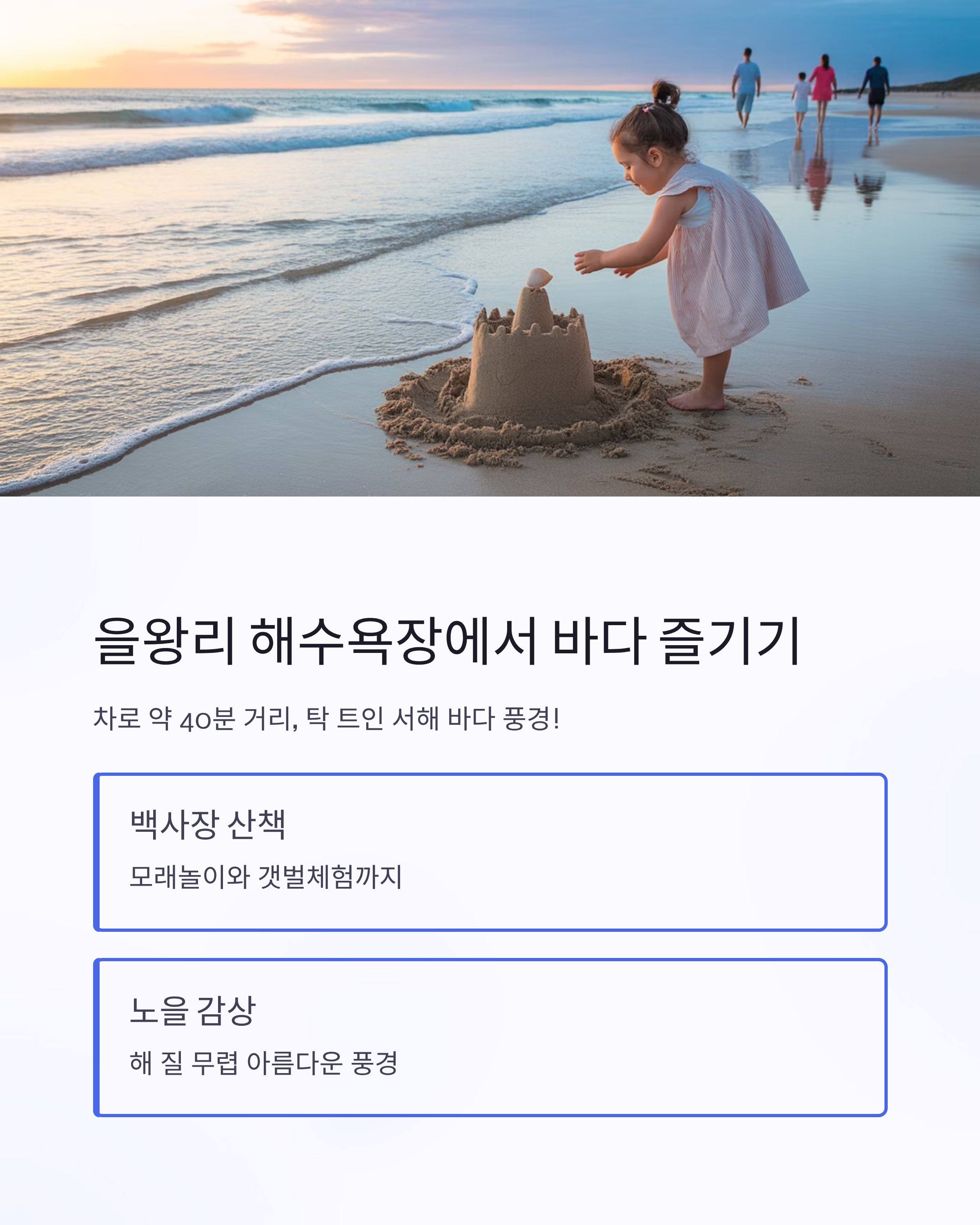 차로 약 40분 정도 걸리며, 도착하면 탁 트인 서해의 바다 풍경이 펼쳐집니다. 백사장 산책은 물론, 모래놀이와 갯벌체험까지 가능해서 가족 단위 여행객에게도 안성맞춤이에요.