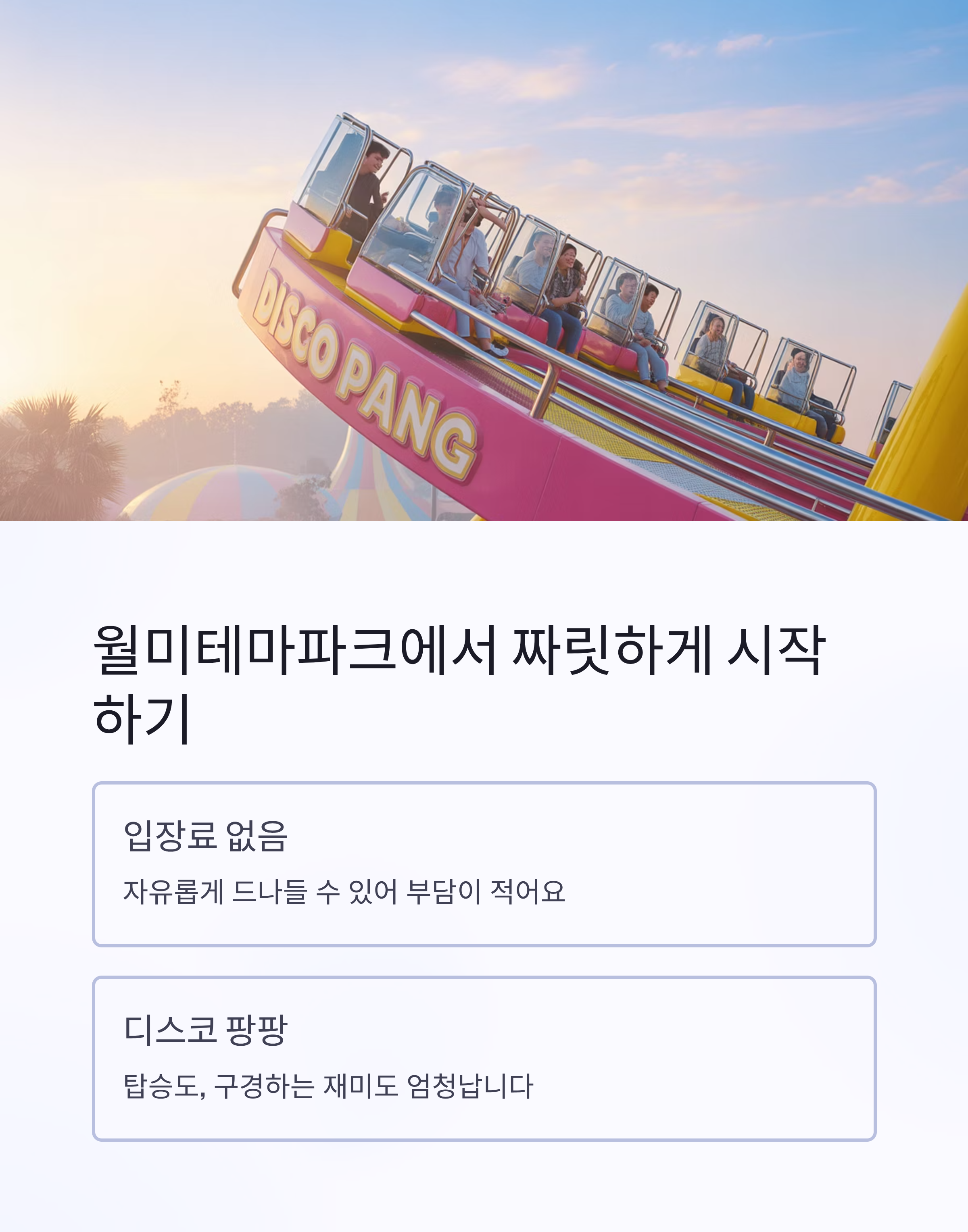 입장료 없이 자유롭게 드나들 수 있는 구조라 부담도 적고, 유명한 ‘디스코 팡팡’은 탑승자뿐만 아니라 구경하는 재미도 엄청납니다. 놀이기구는 짧고 굵게, 스릴 넘치는 라인업이 많아 오전 시간대에 방문하면 기다림 없이 즐길 수 있어요.