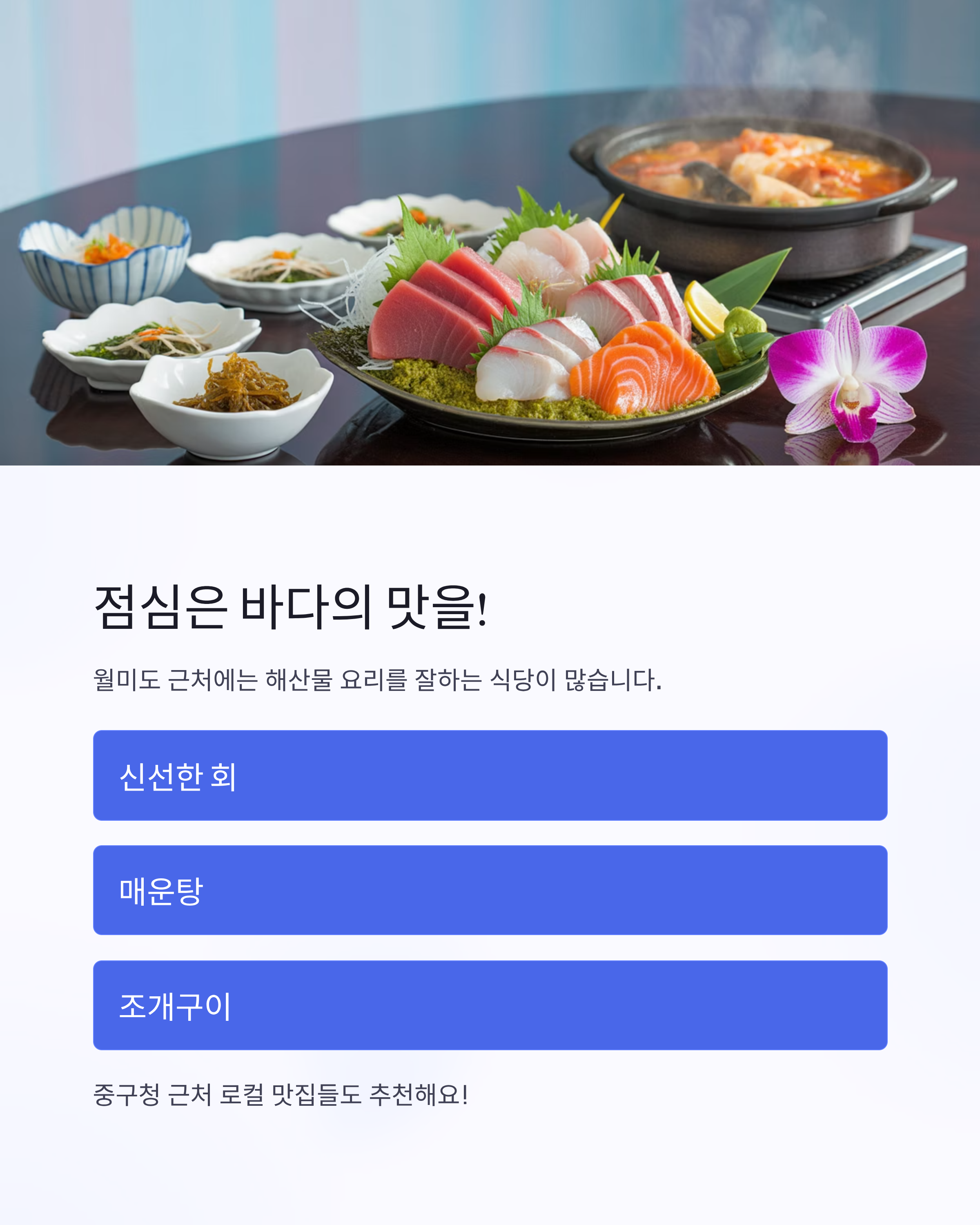 점심으로는 신선한 회, 매운탕, 조개구이 등 바다의 맛을 제대로 느낄 수 있는 식당을 추천해요. 중구청 근처에는 오래된 로컬 맛집들이 모여 있어 실패 확률도 낮습니다.