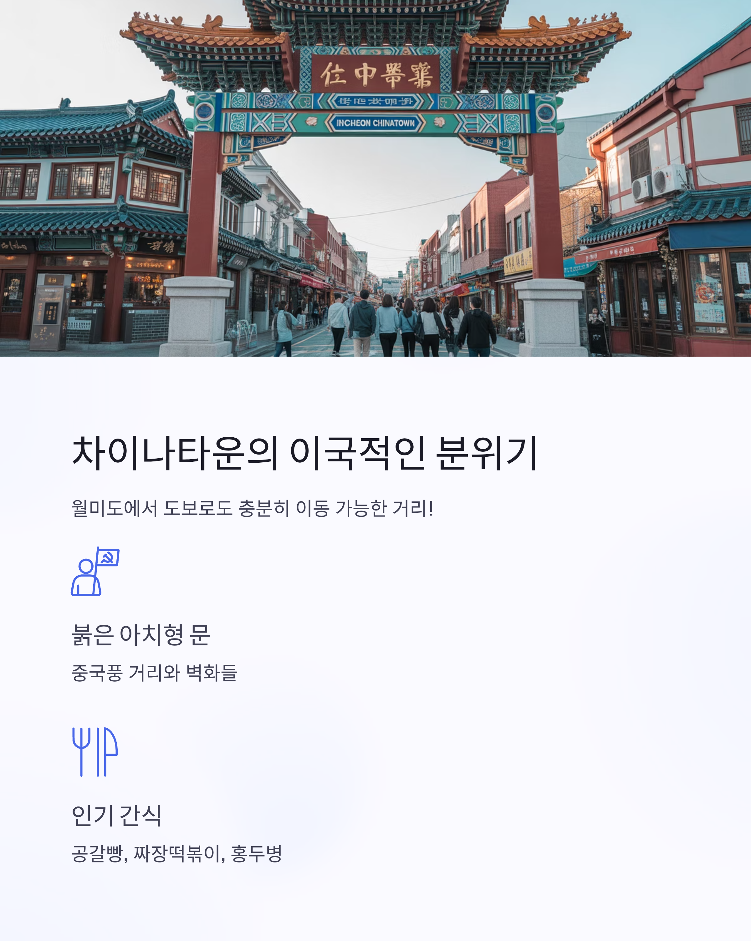 붉은 아치형 문을 지나면 펼쳐지는 중국풍 거리와 벽화들, 그리고 각종 중화요리 향기에 눈과 코가 즐거워지는 곳! 간단한 간식거리로는 공갈빵, 짜장떡볶이, 홍두병 등이 인기예요.