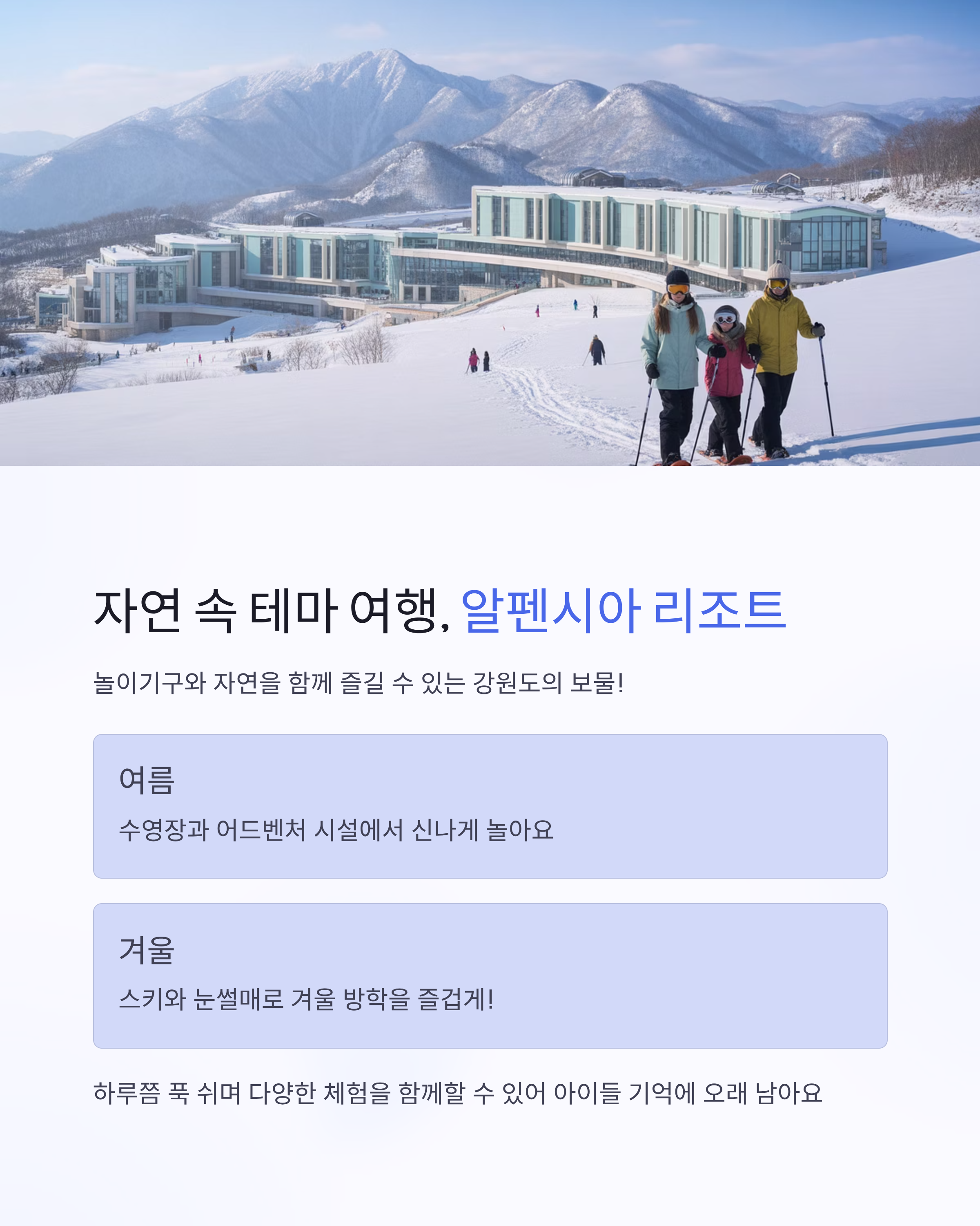 여름에는 수영장과 어드벤처 시설, 겨울에는 스키와 눈썰매까지!