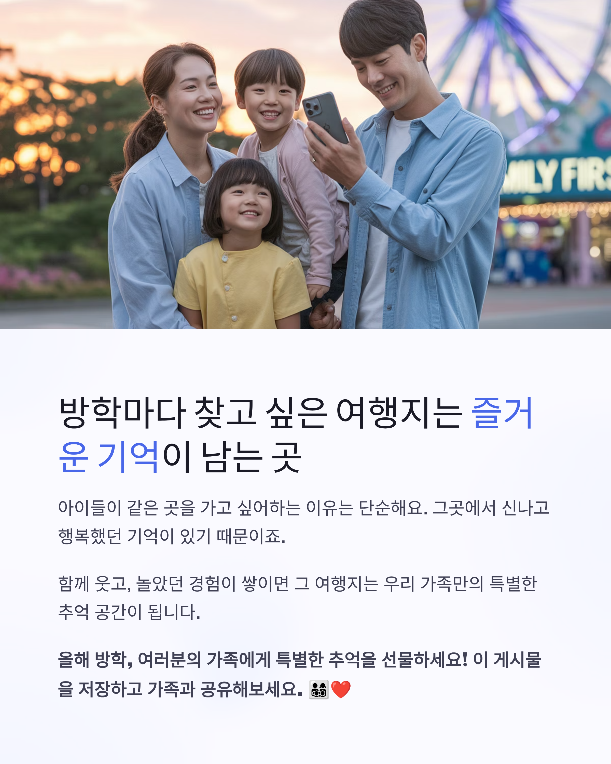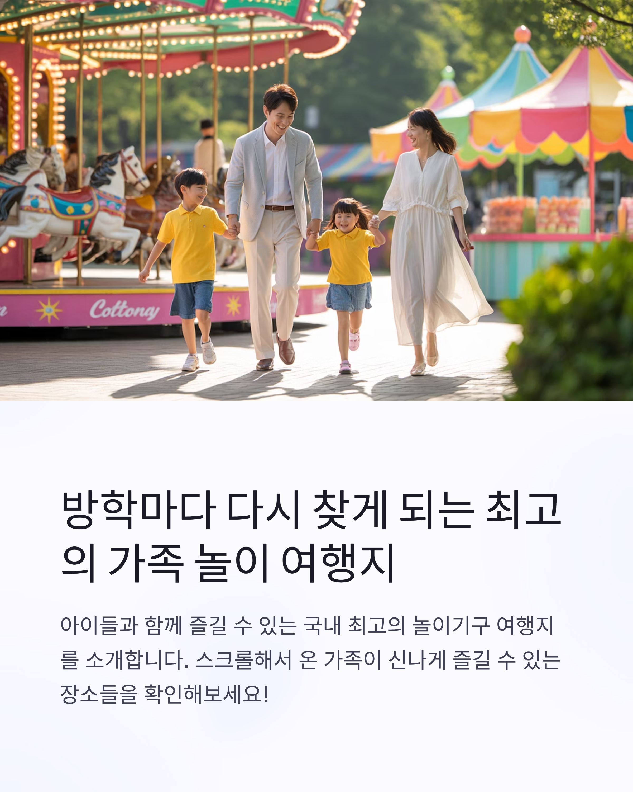 방학 시즌이 되면 아이들과 어디로 여행을 갈지 고민이 많아지죠. 특히 온 가족이 함께 즐길 수 있는 놀이기구가 있는 장소는 언제나 인기예요. 오늘은 방학마다 반복해서 가고 싶을 정도로 매력적인 가족 여행지를 소개해 드릴게요. 단순한 관광지를 넘어서 아이들도 어른도 모두 신나게 즐길 수 있는 곳들이랍니다.