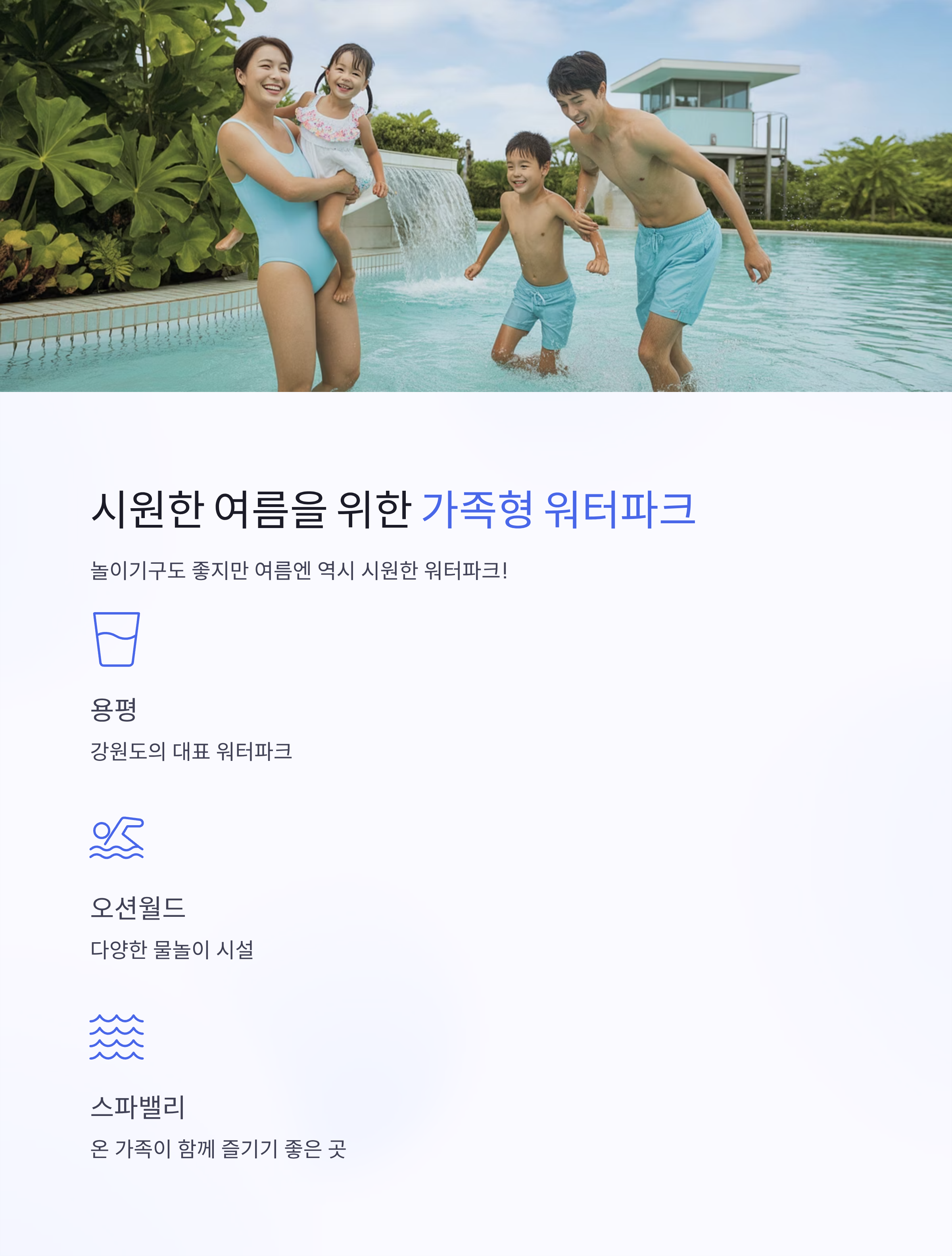 용평, 오션월드, 스파밸리 등 지역마다 매력적인 워터파크가 다양하죠.