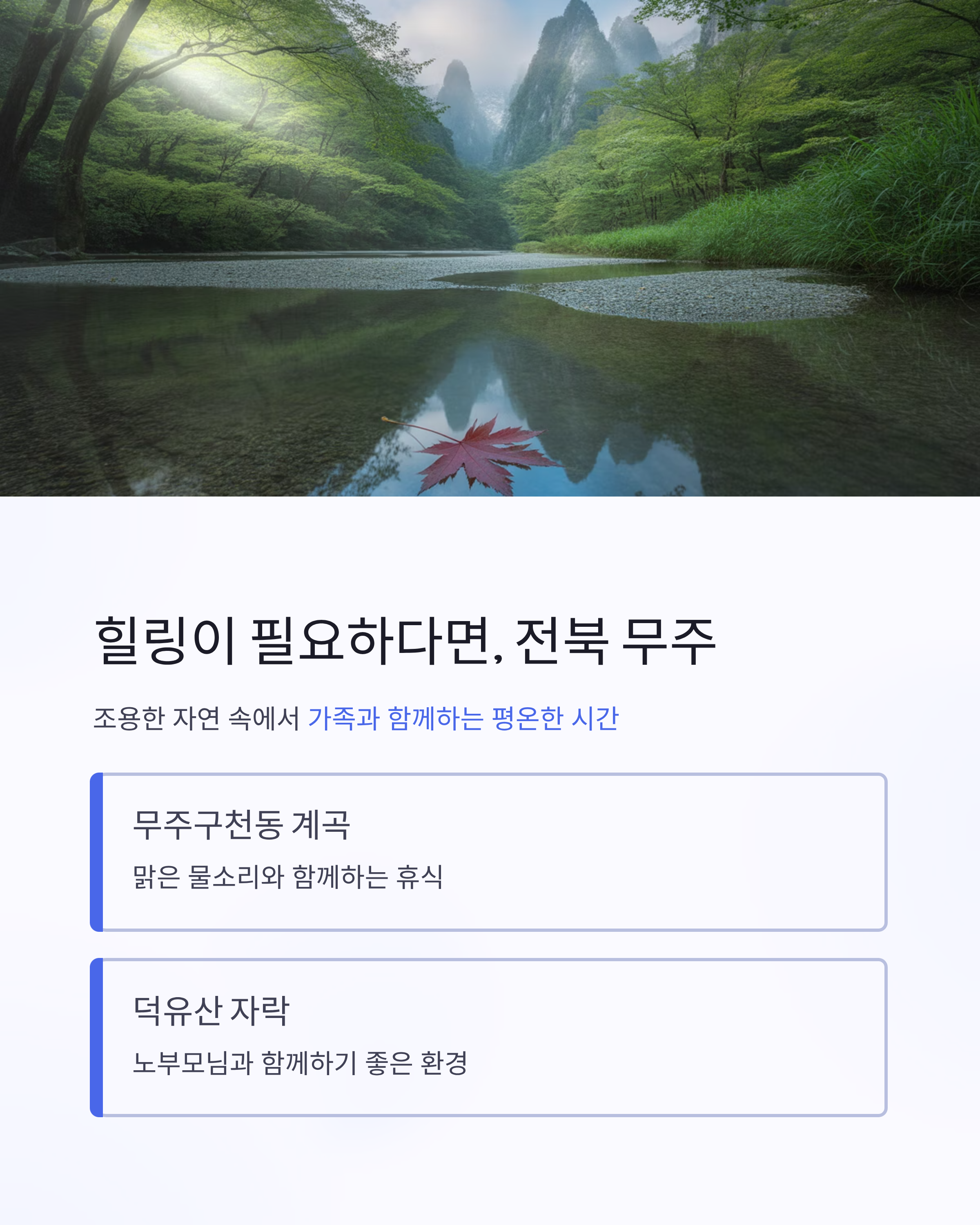 | 무주 | 어르신 포함 | 계곡, 산, 조용한 자연 |