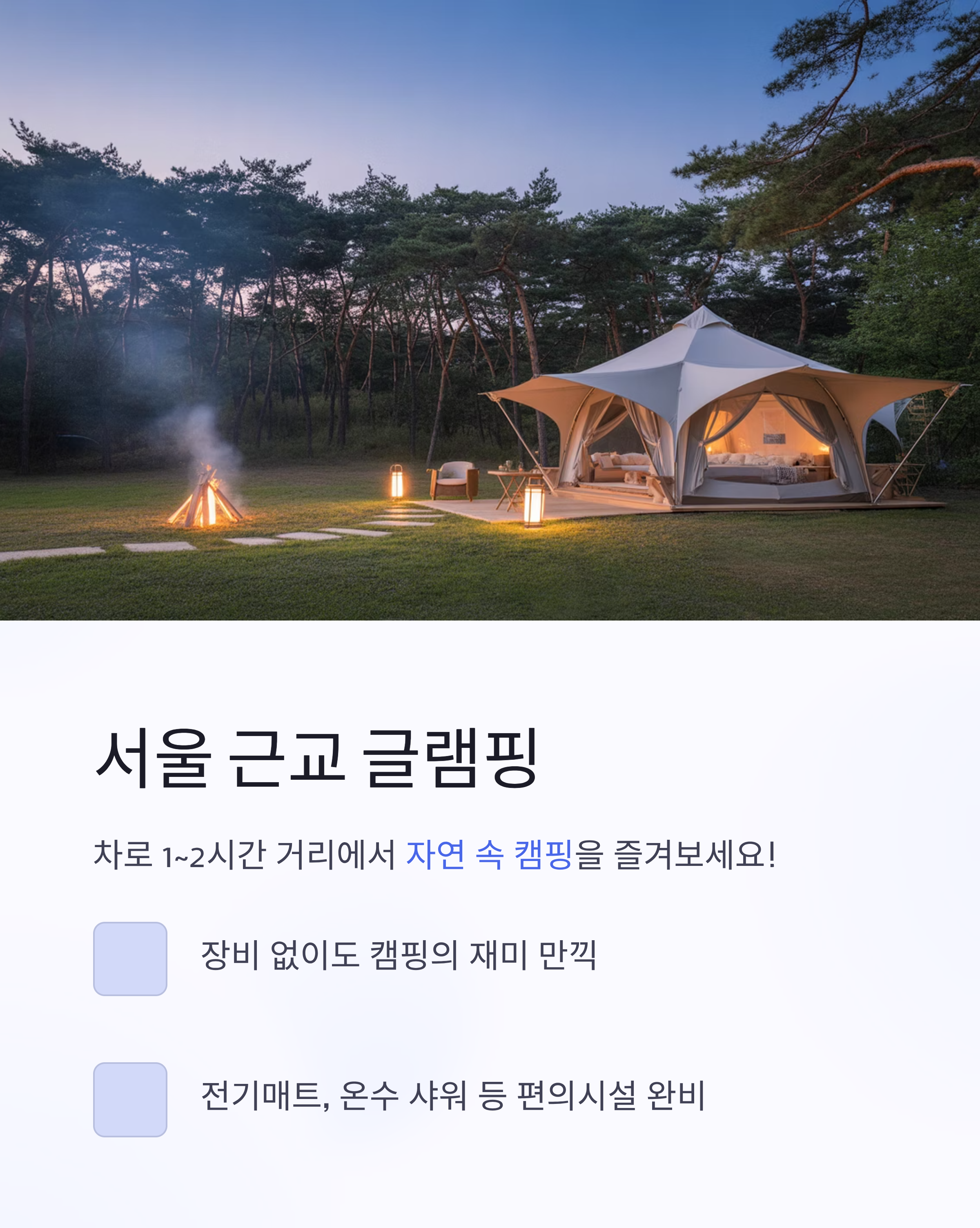 | 서울 근교 | 바쁜 직장인 가족 | 글램핑, 짧은 일정, 자연 체험 |