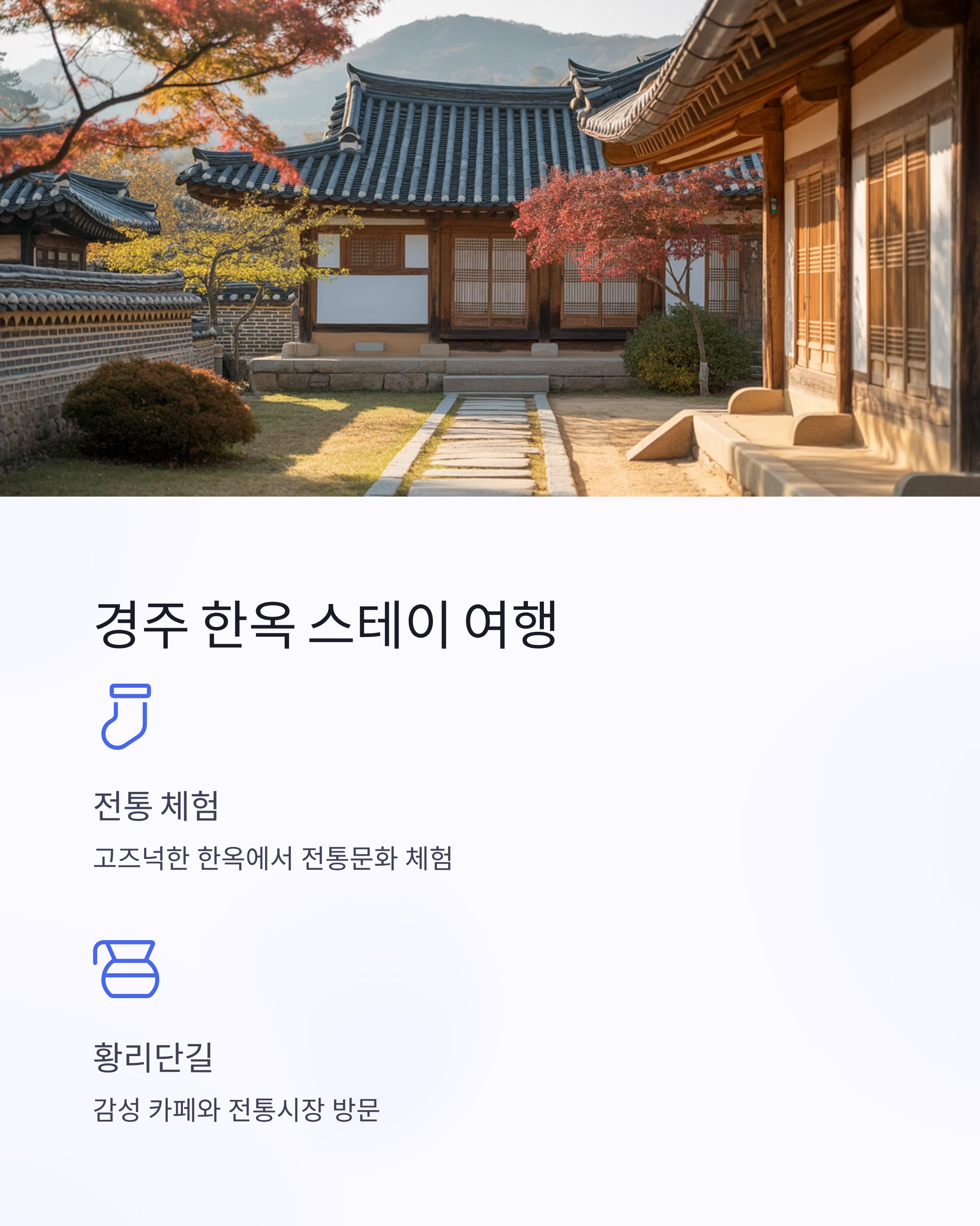 | 경주 | 부모님 위주 | 전통문화, 한옥스테이, 황리단길 |