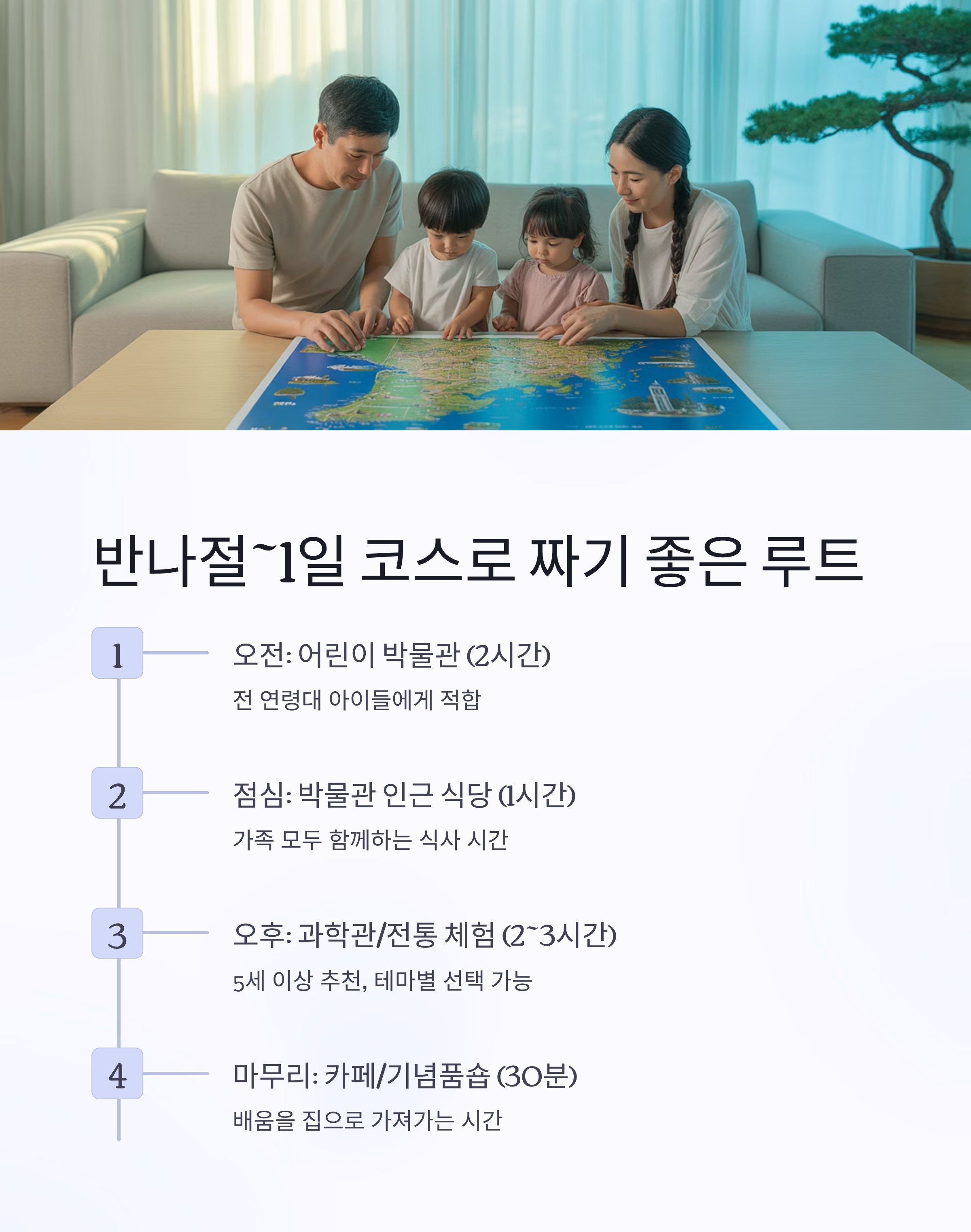 | 오후 | 과학관 or 전통 체험 마을 | 2~3시간 | 5세 이상 |