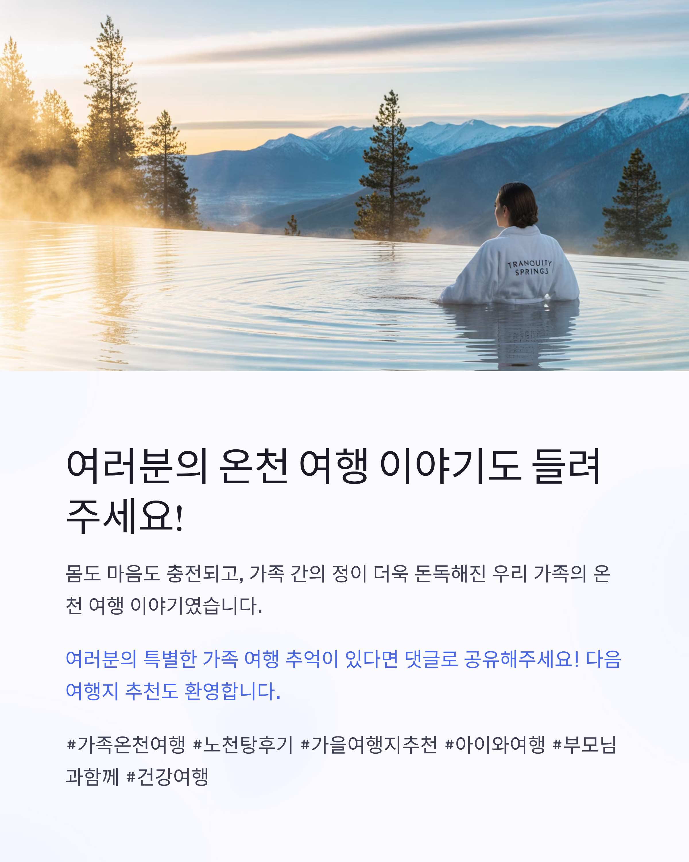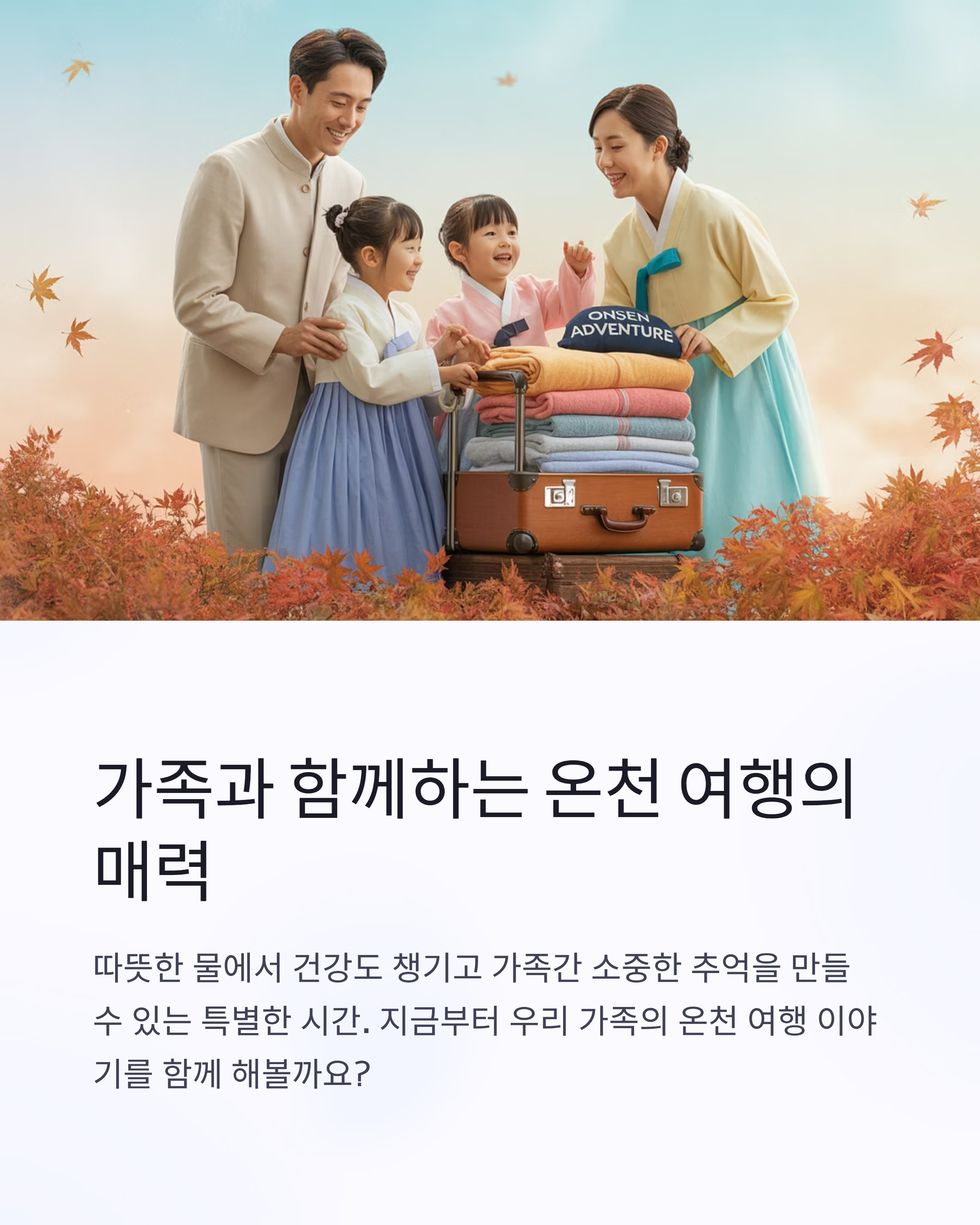 가족들과 함께 떠난 이번 온천 여행은 단순한 휴식이 아니었어요. 따뜻한 물에 몸을 담그며 건강도 챙기고, 오랜만에 가족 간의 정도 나눌 수 있었던 소중한 시간이었습니다. 피로를 풀고 웃음소리가 끊이지 않았던 하루하루를 공유해볼게요. 온천의 매력과 가족 여행의 소소한 감동이 궁금하시다면 지금부터 함께 떠나보세요.