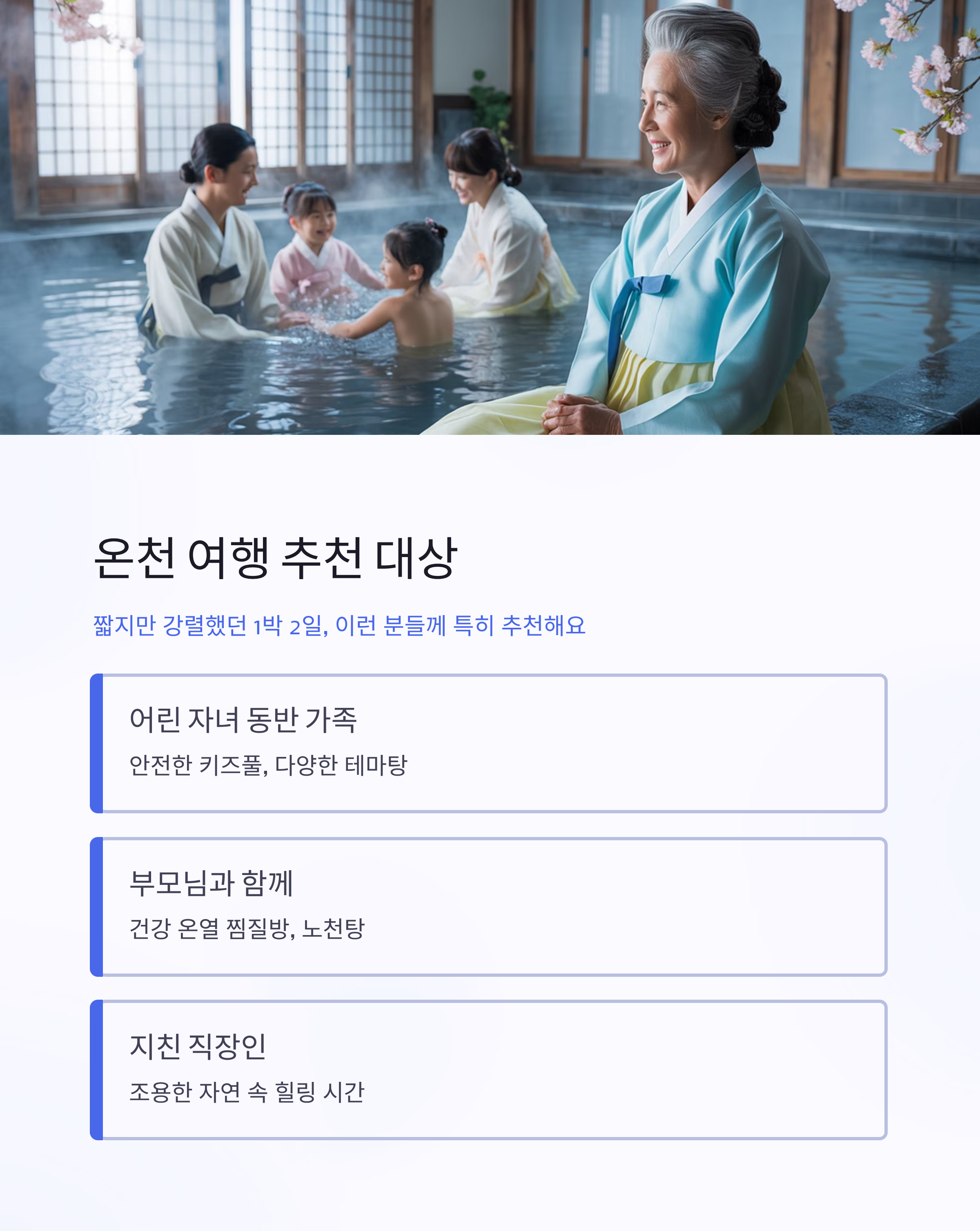 온천 여행은 휴식을 원하는 누구에게나 잘 어울리지만, 특히 가족 단위 여행자에게는 더할 나위 없이 좋습니다.