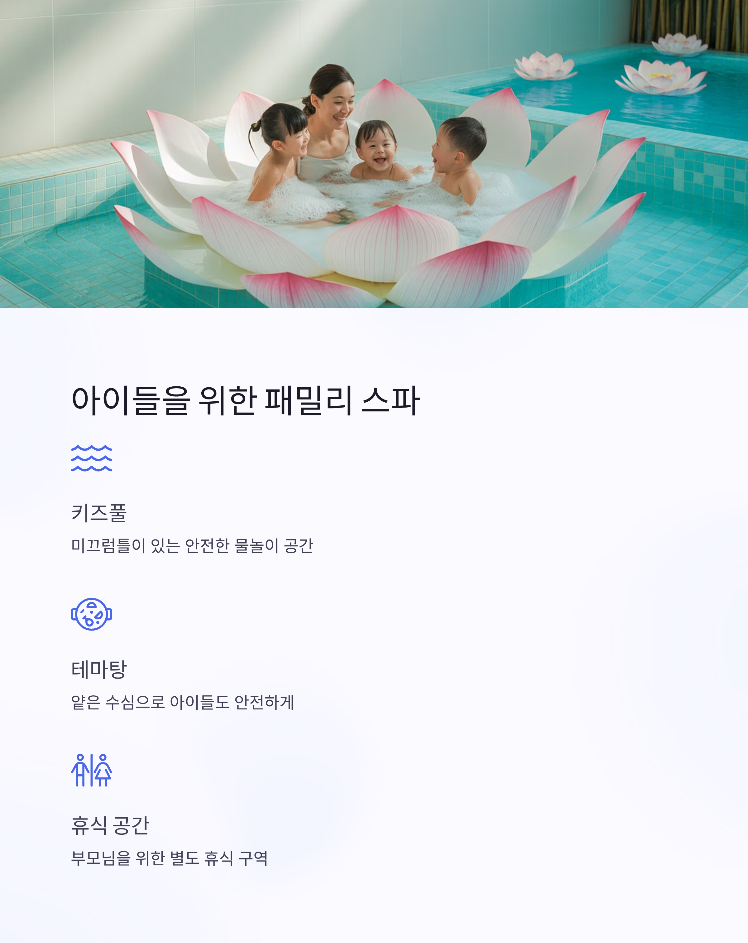 가족 단위 방문객이 많다 보니, 어린이도 안전하게 즐길 수 있는 스파 시설이 잘 마련돼 있었어요.