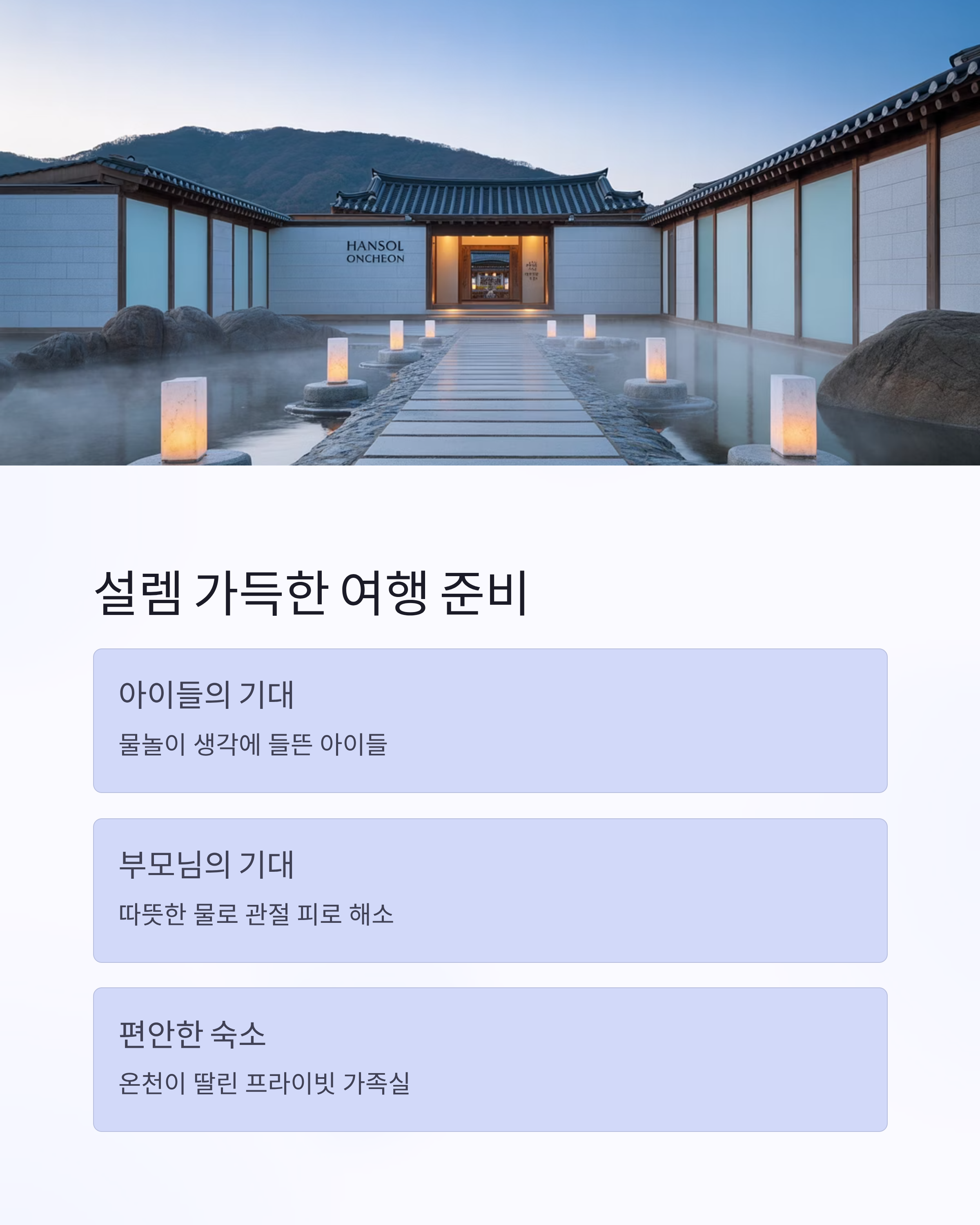 아이들은 물놀이 생각에 신이 나 있고, 부모님은 따뜻한 물로 관절 피로를 푼다며 기대하셨죠.