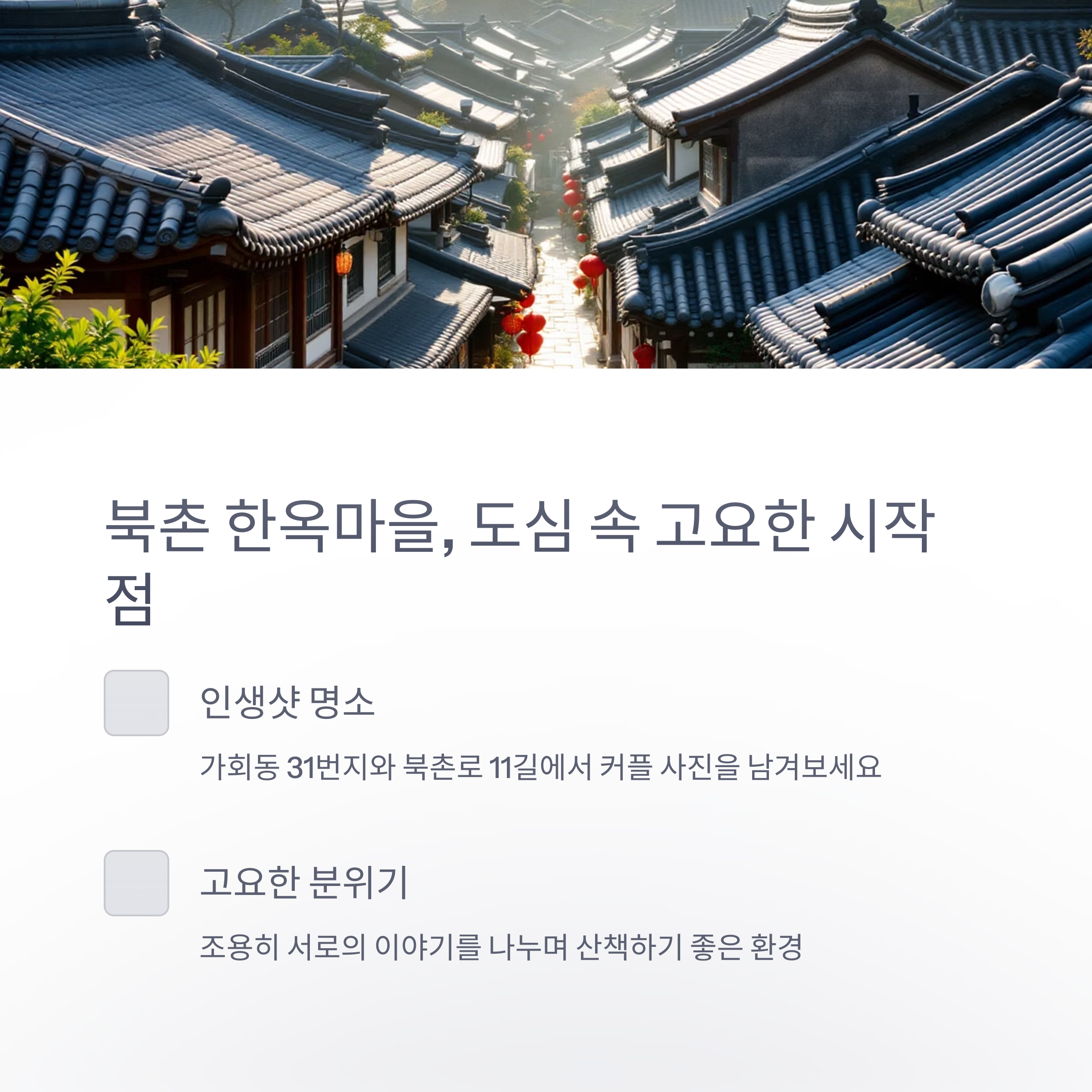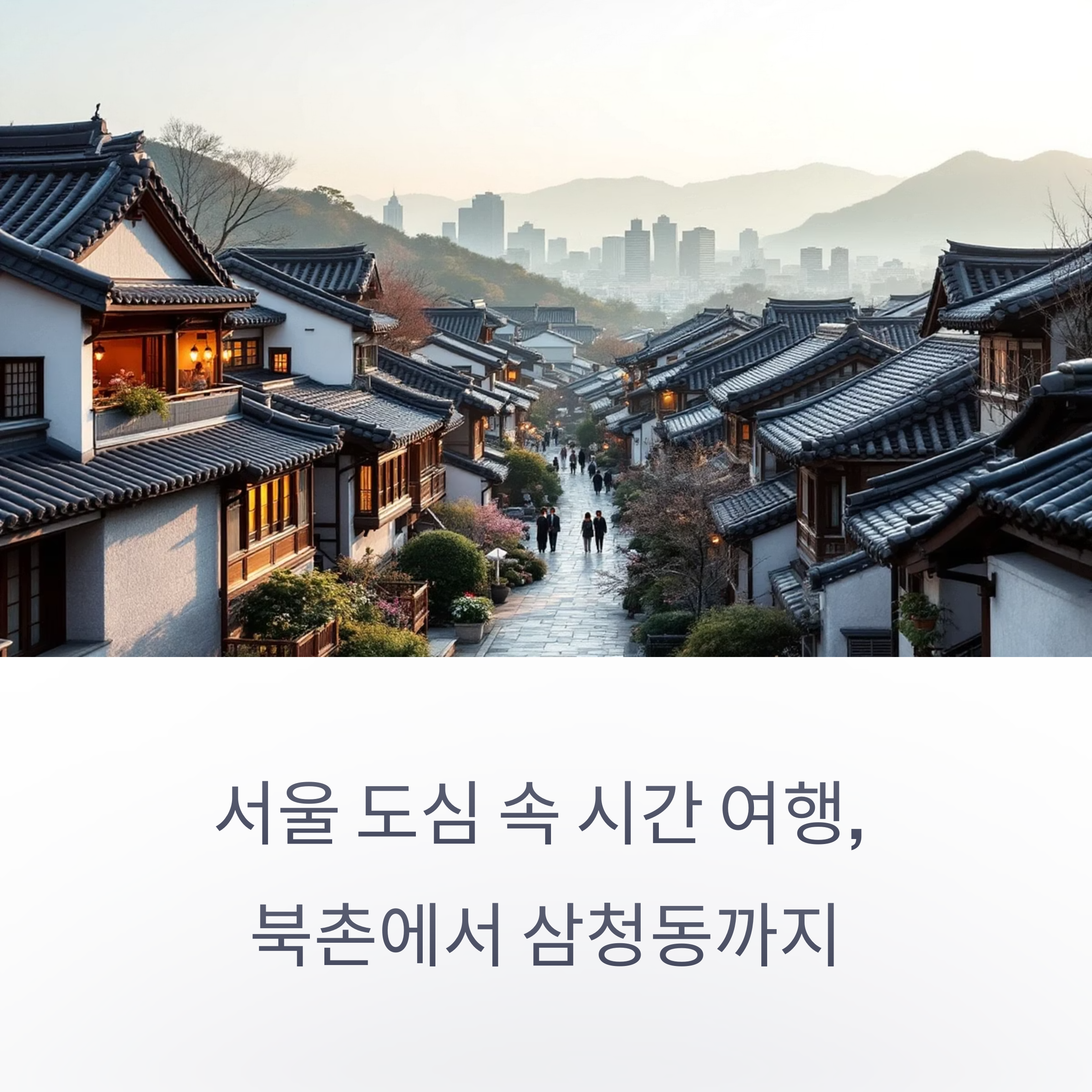한옥의 따뜻한 햇살을 느끼며 산책을 시작하고, 삼청동에서 여유로운 브런치까지 연결됩니다.