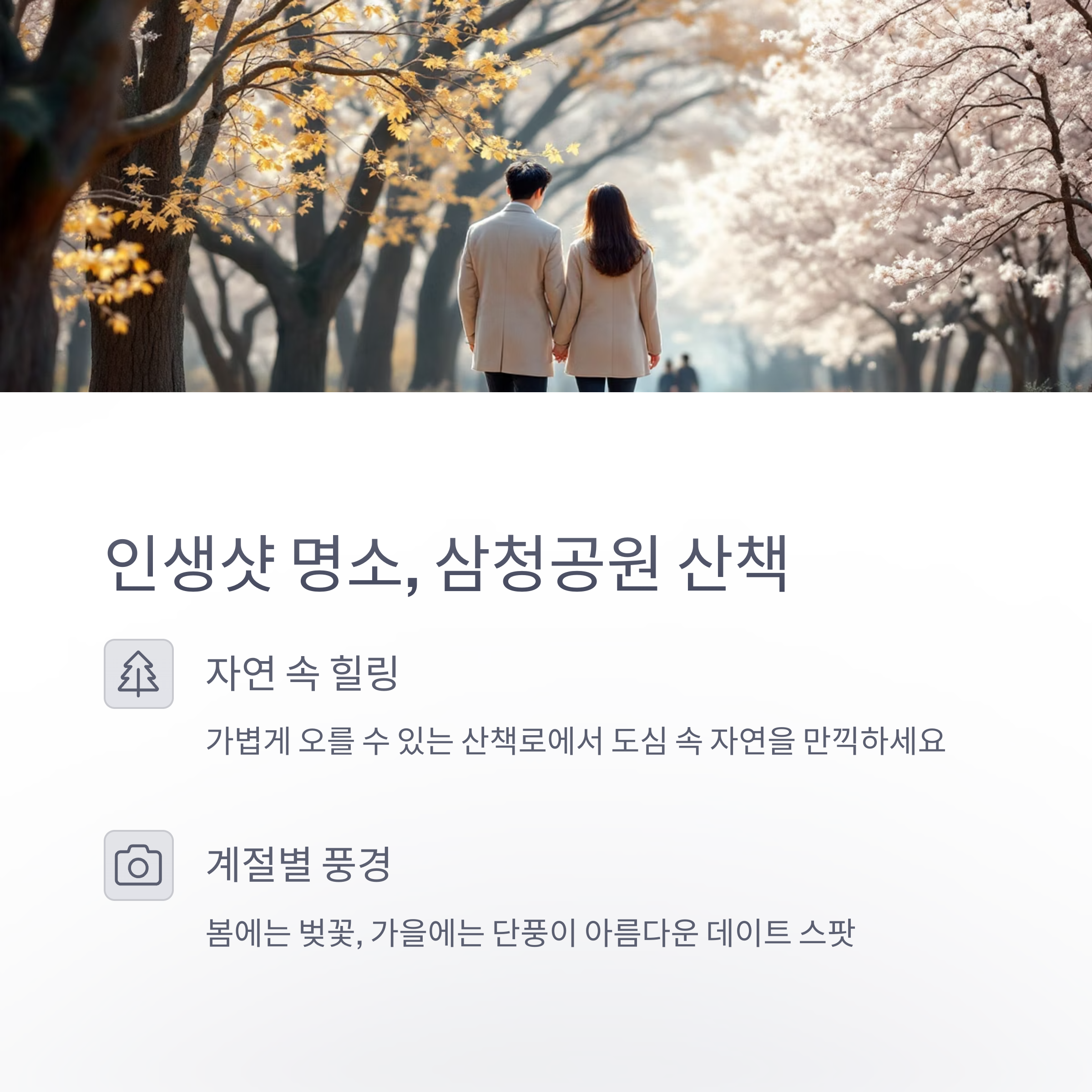 | 오후 3시~5시 | 삼청공원 산책 | 여유롭고 자연친화적인 감성 |