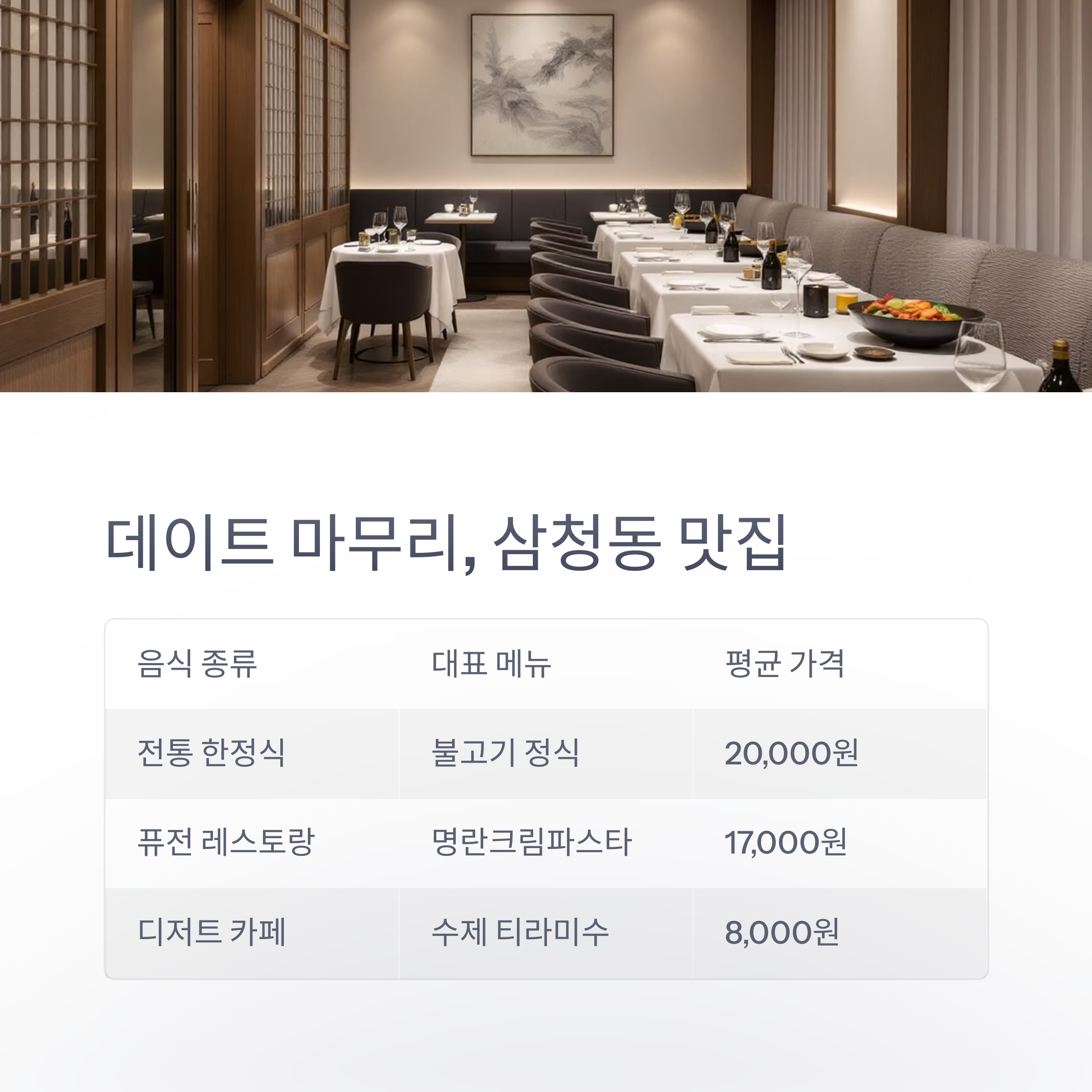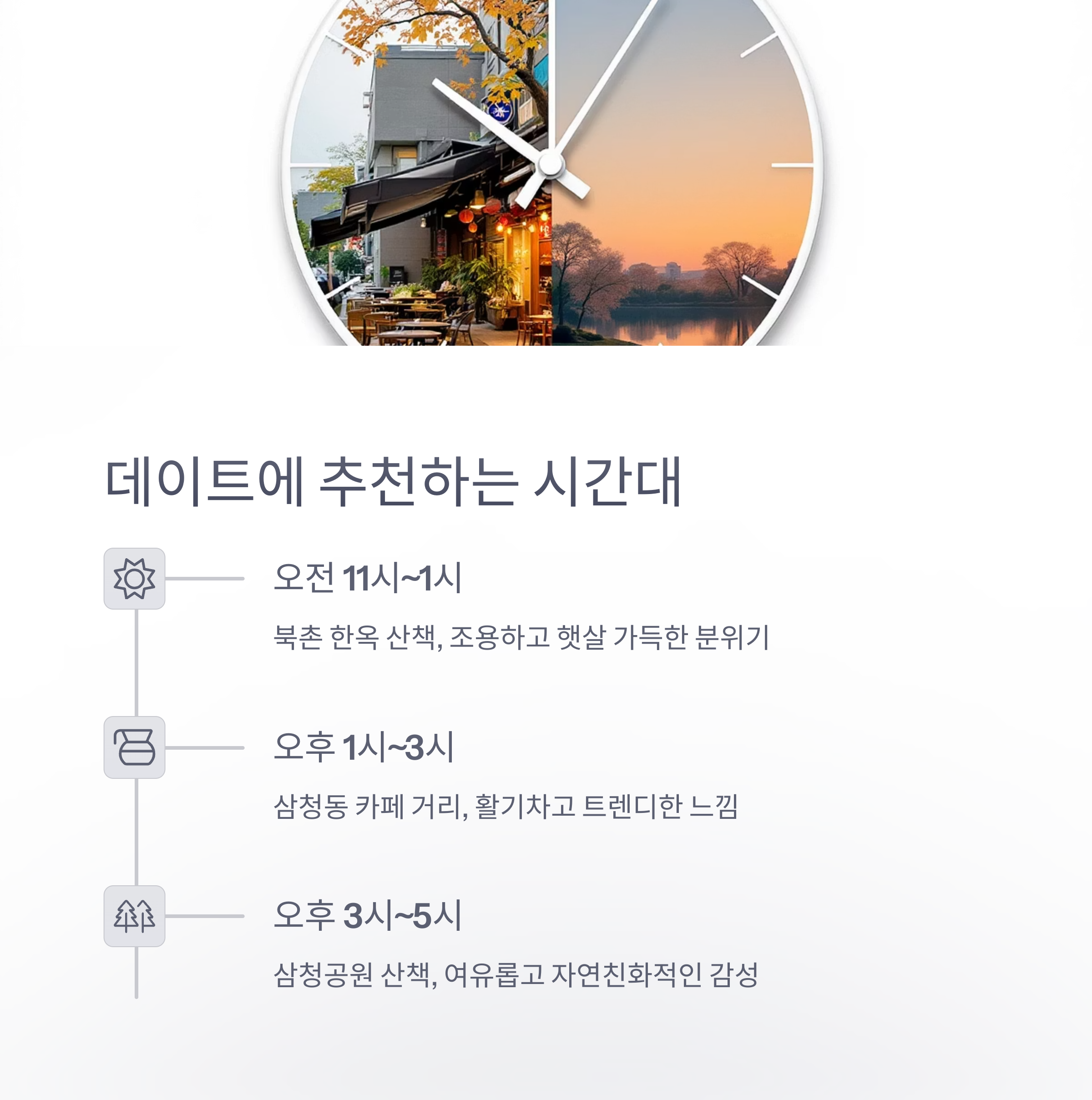 | 오후 1시~3시 | 삼청동 카페 거리 | 활기차고 트렌디한 느낌 |
