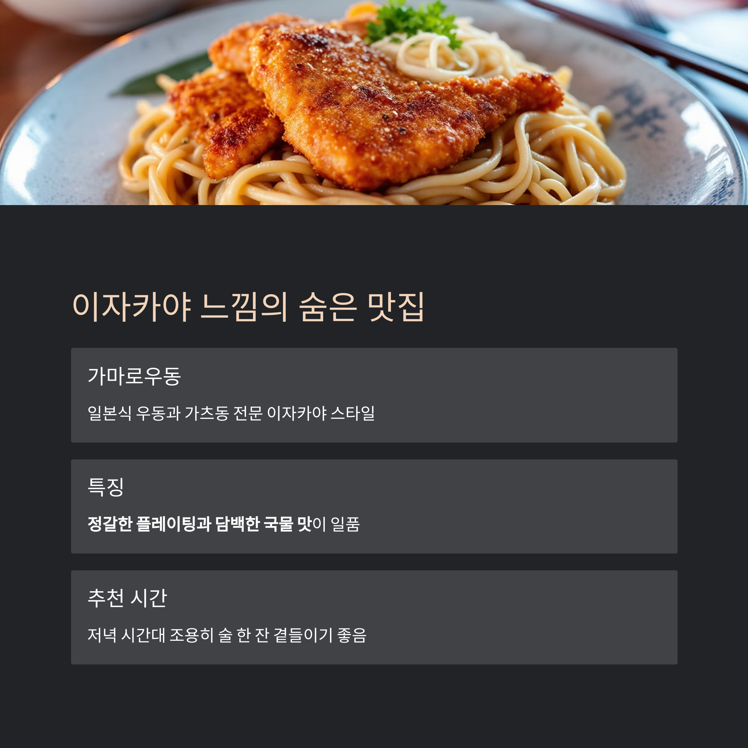 | 가마로우동 | 가츠동, 냉우동 | 이자카야 분위기, 저녁 추천 |