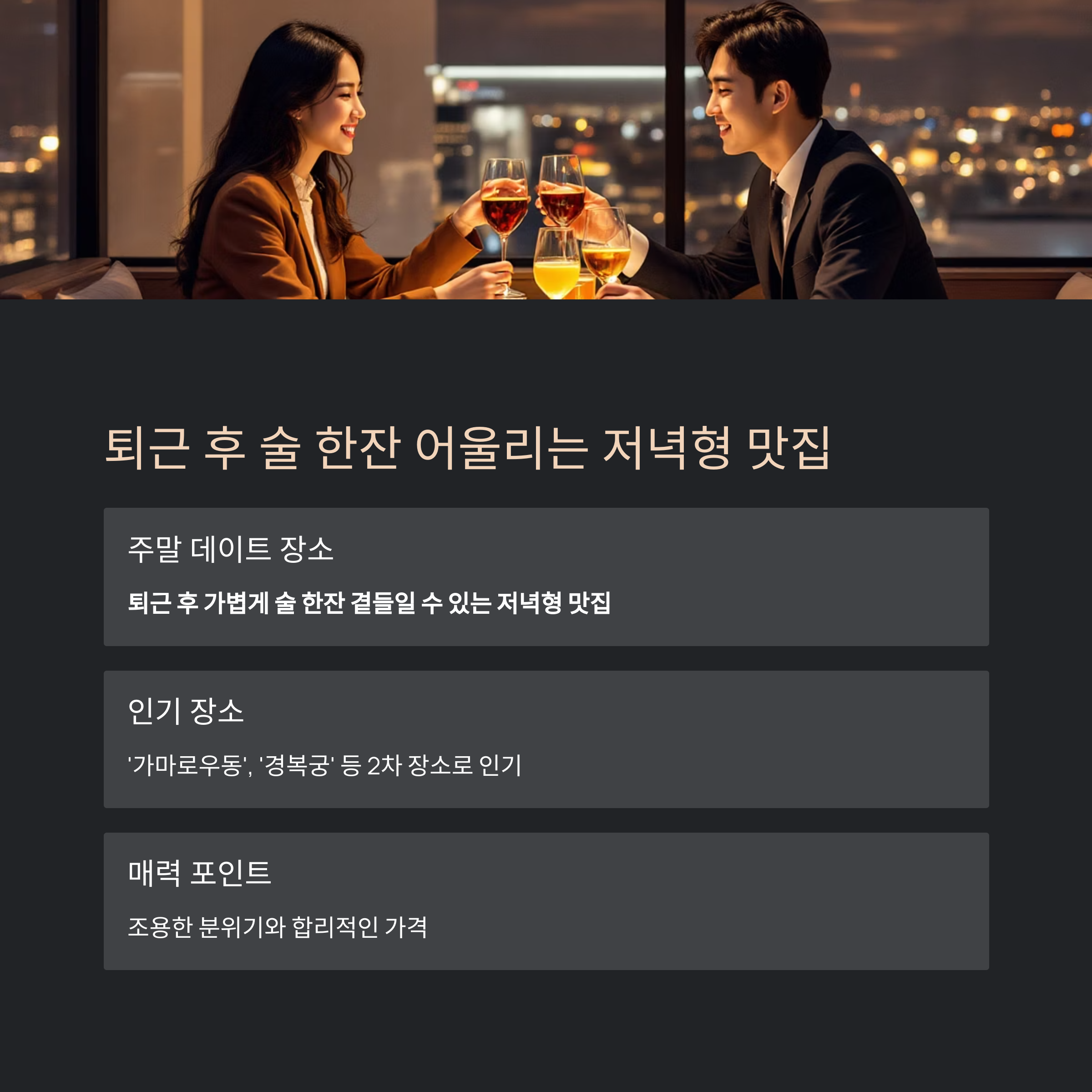 퇴근 후 가볍게 술 한잔 곁들일 수 있는 저녁형 맛집도 많다는 점에서
