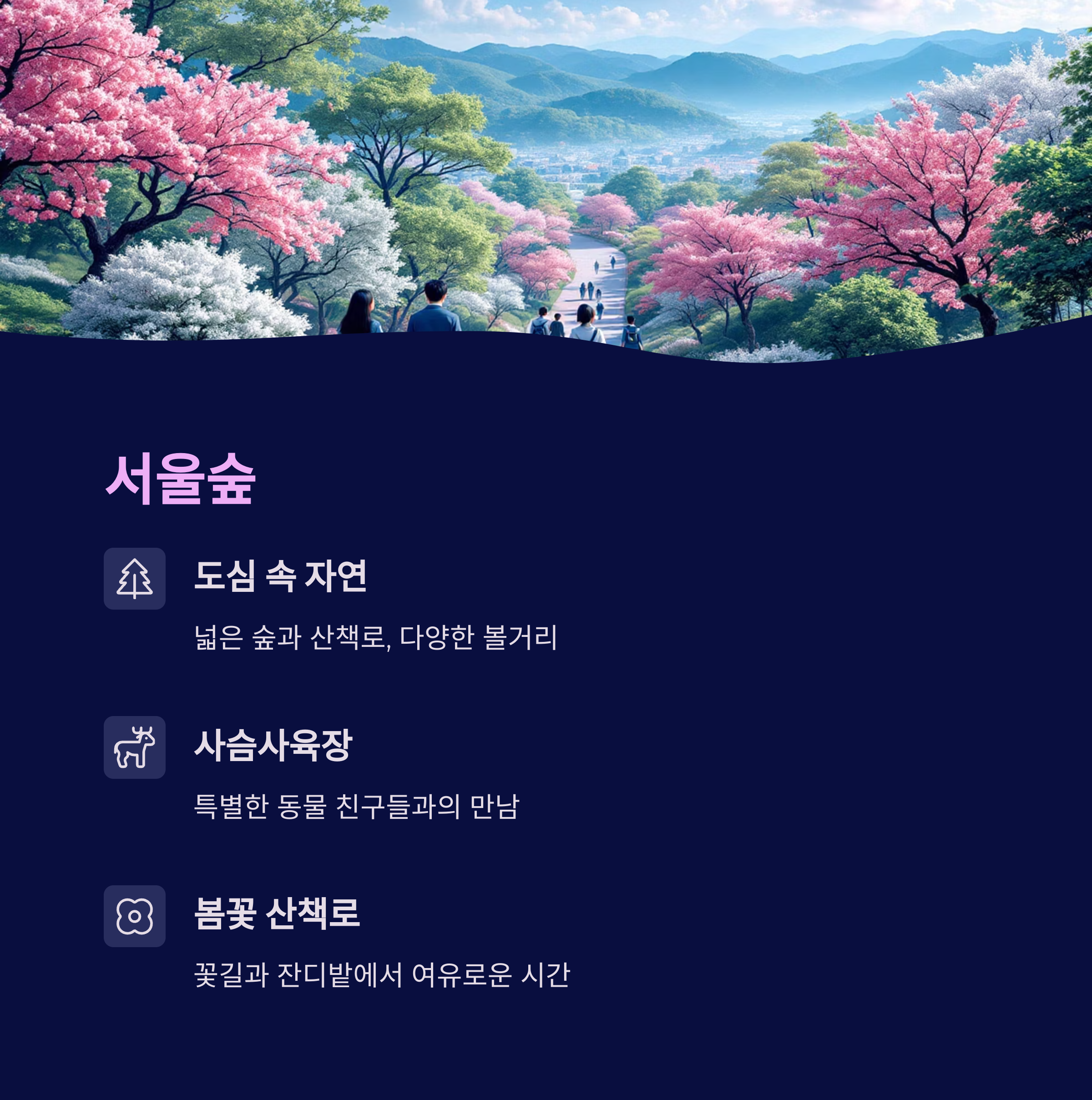 | 서울숲 | 숲속 감성 + 여유로운 데이트 | 자연과 예술의 조화 |