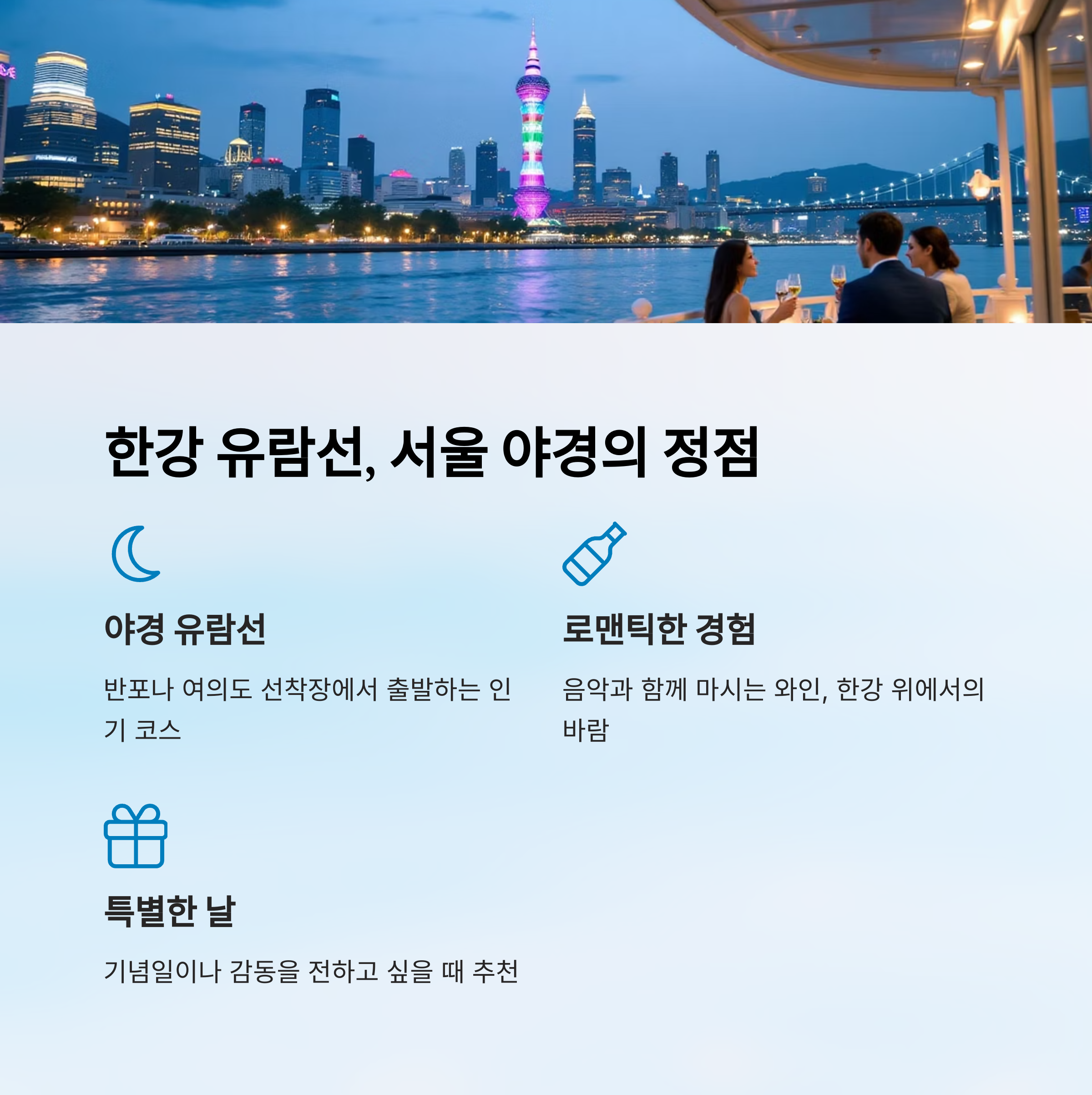 반포나 여의도 선착장에서 출발하는 야경 유람선은 인기 데이트 코스입니다