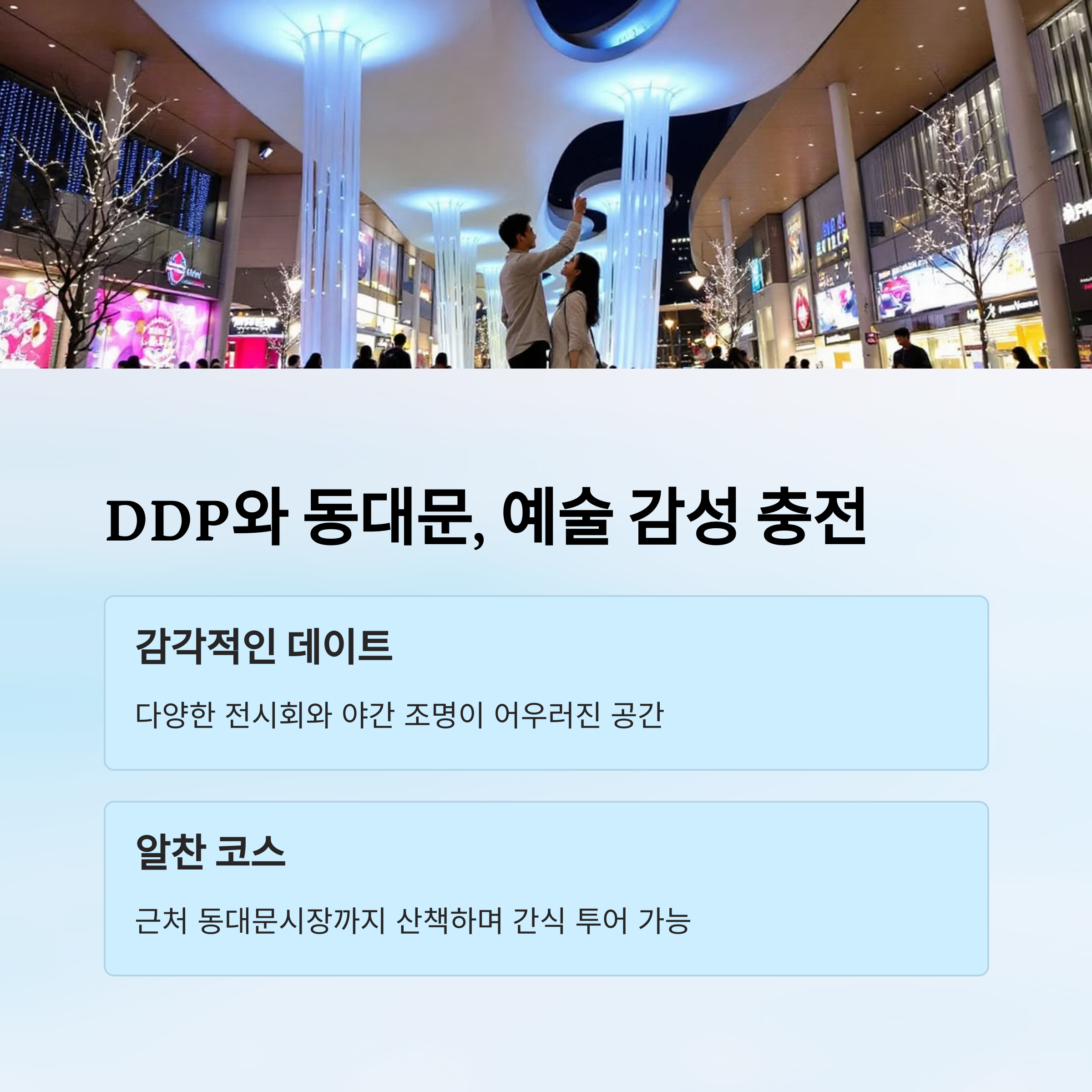DDP는 다양한 전시회와 야간 조명이 어우러져 감각적인 데이트 장소입니다