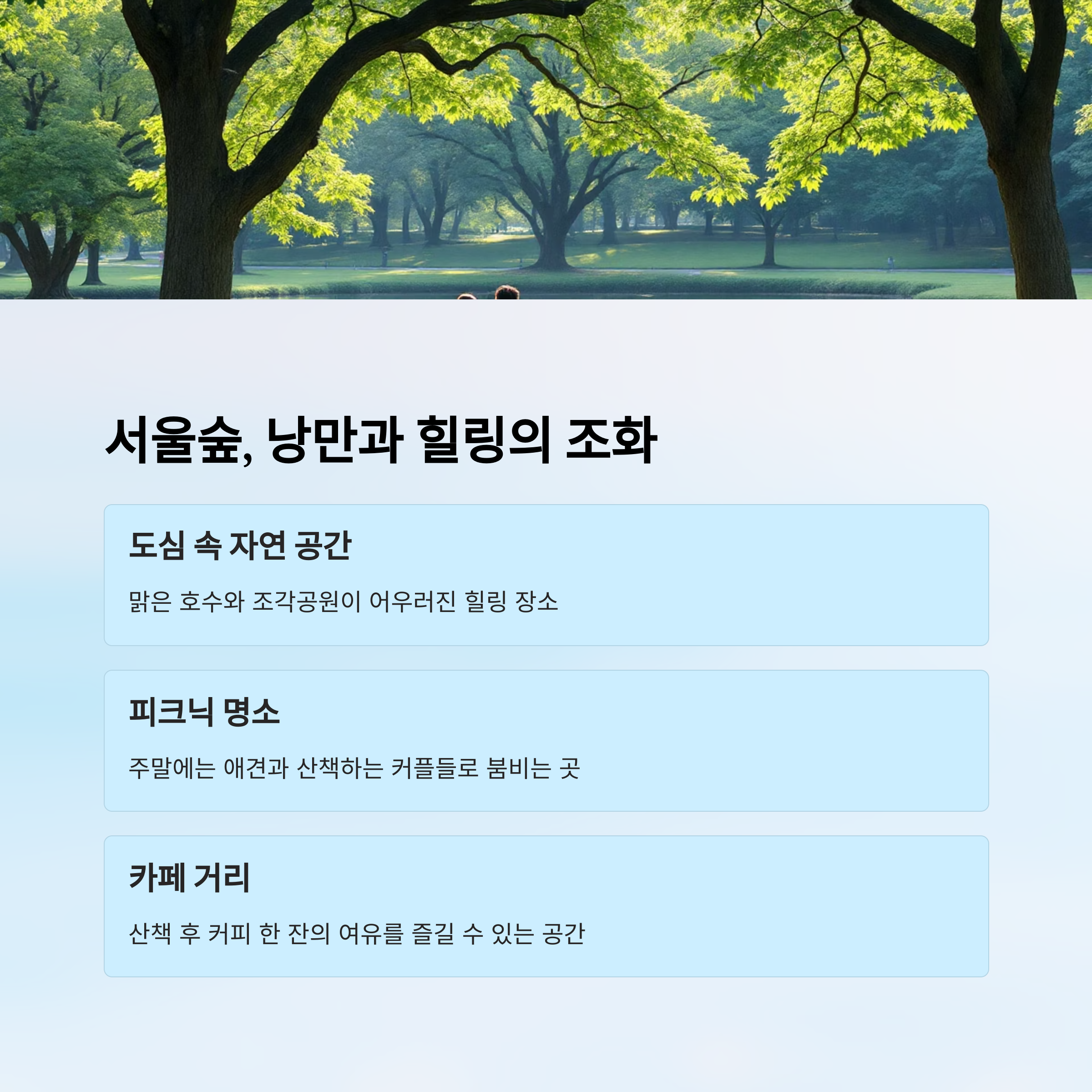 | 서울숲 | 도심 속 자연과 카페 거리 | 오후~해질녘 |
