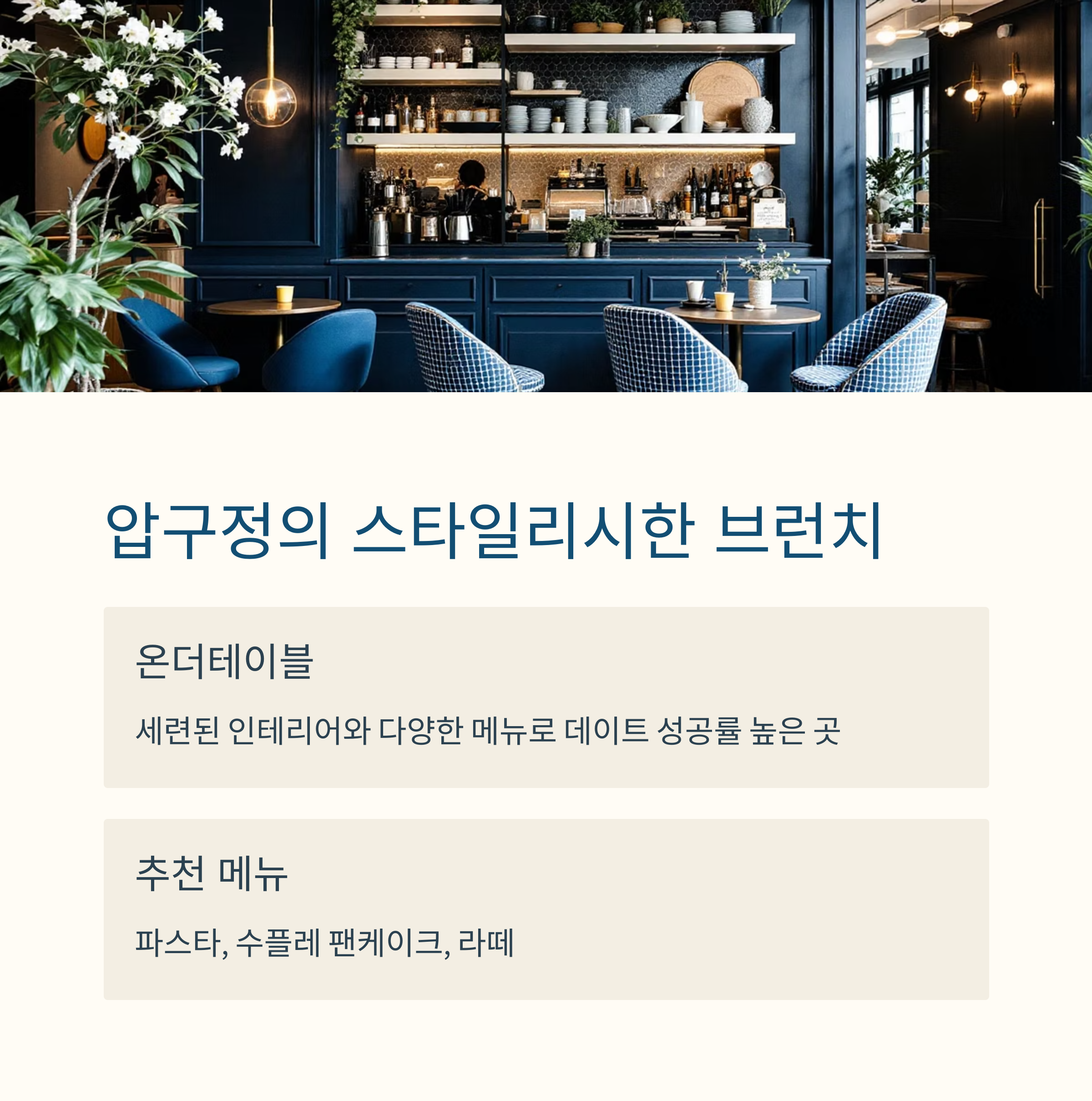 | 압구정 | 온더테이블 | 스타일리시, 다양한 메뉴 |