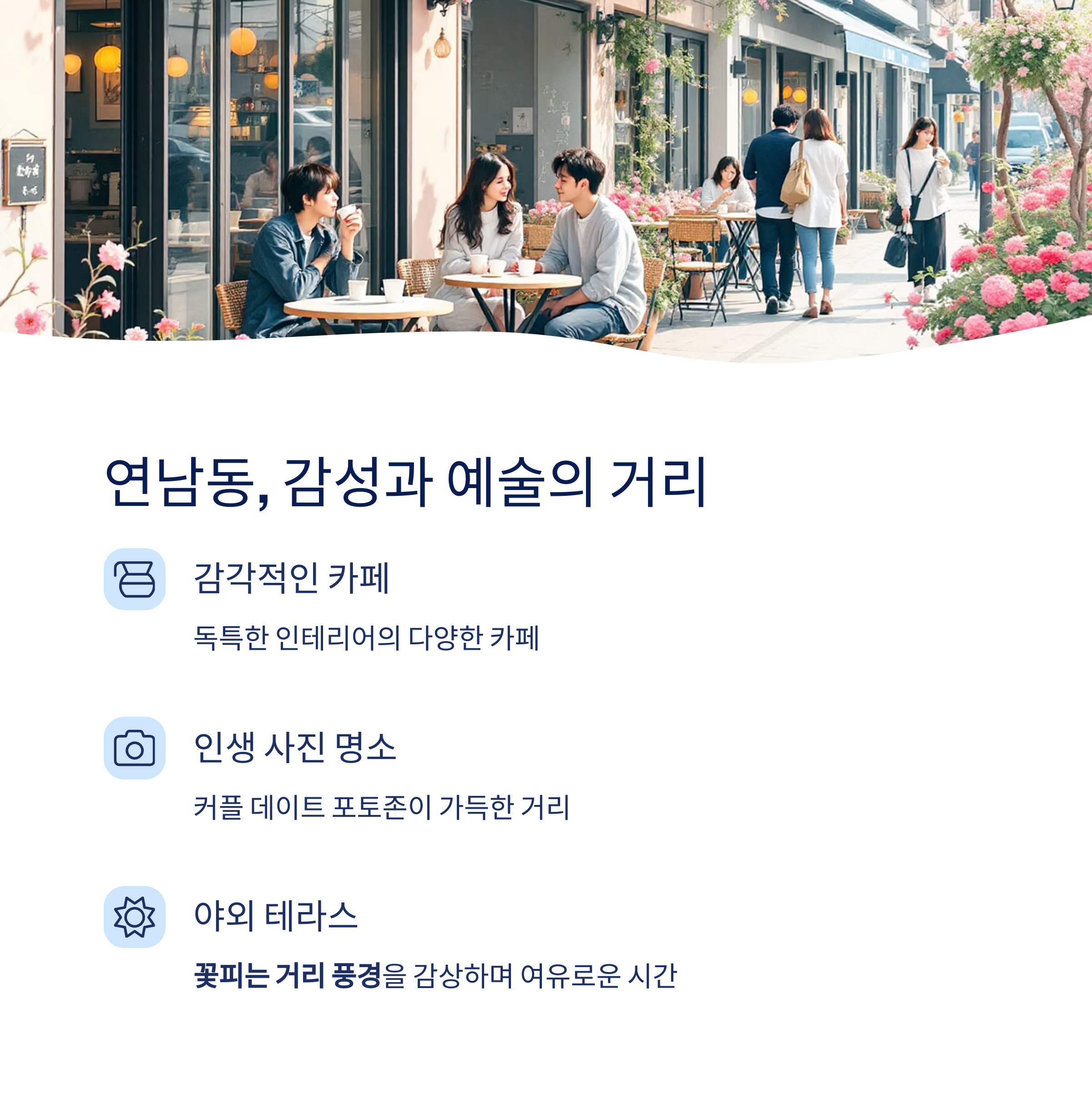 | 연남동 | 감성, 트렌디함 | 개성 있는 카페거리 |