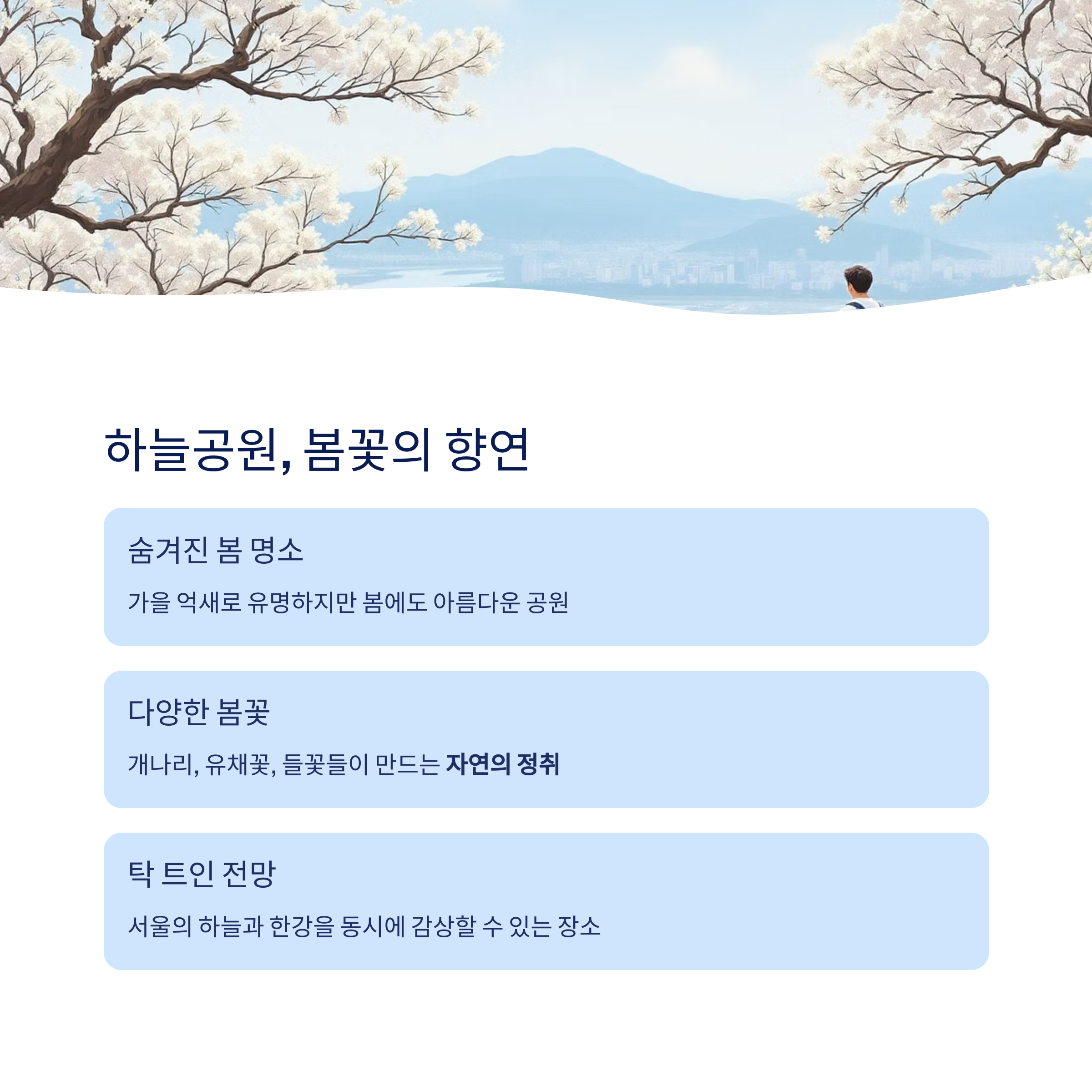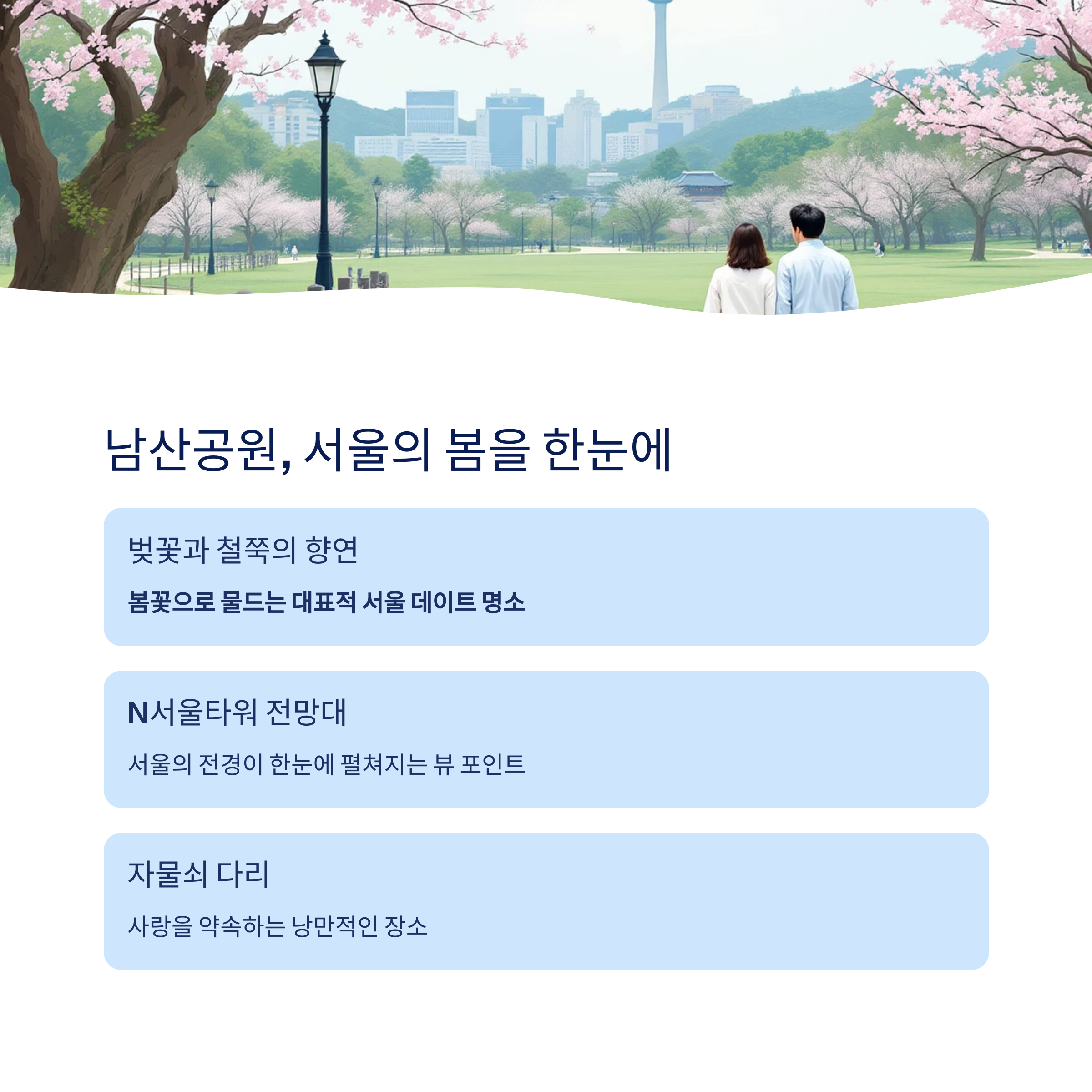 | 남산공원 | 낭만, 전망 | 벚꽃길+서울 전경 |