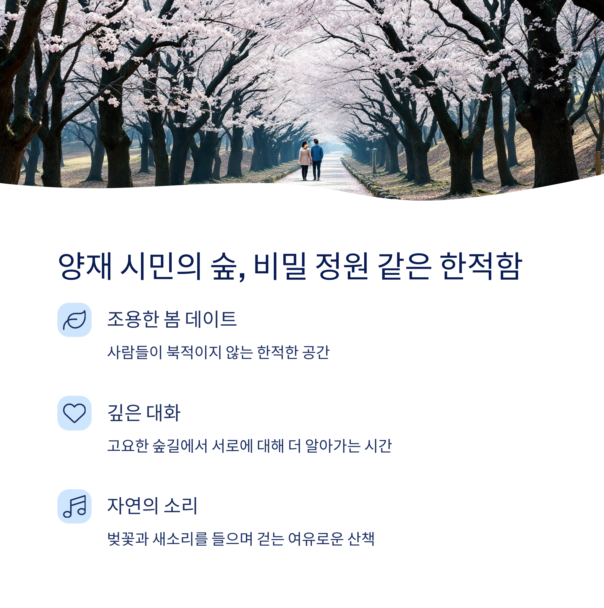 고요한 숲길을 따라 벚꽃과 새소리를 들으며 걷다 보면 서로에 대해 더 깊이 이야기할 수 있습니다.
