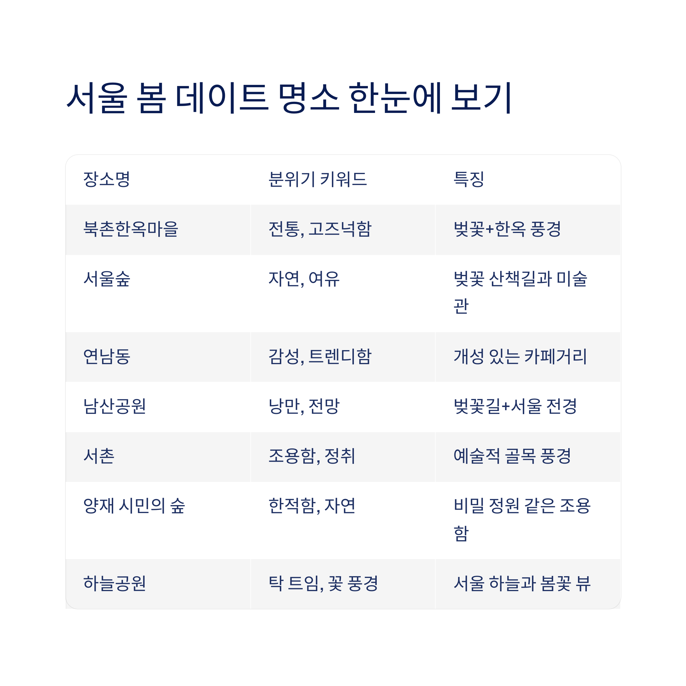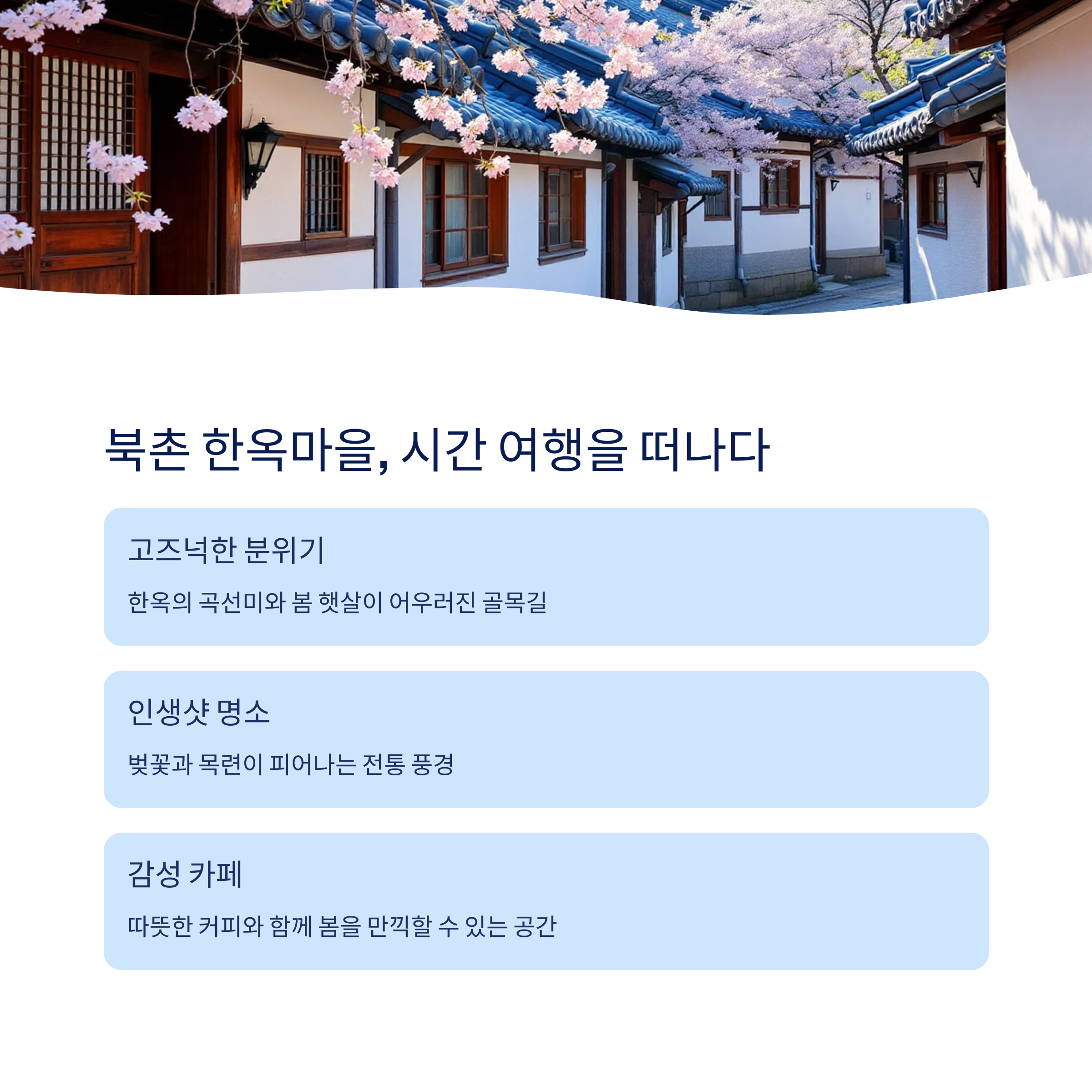 | 북촌한옥마을 | 전통, 고즈넉함 | 벚꽃+한옥 풍경 |