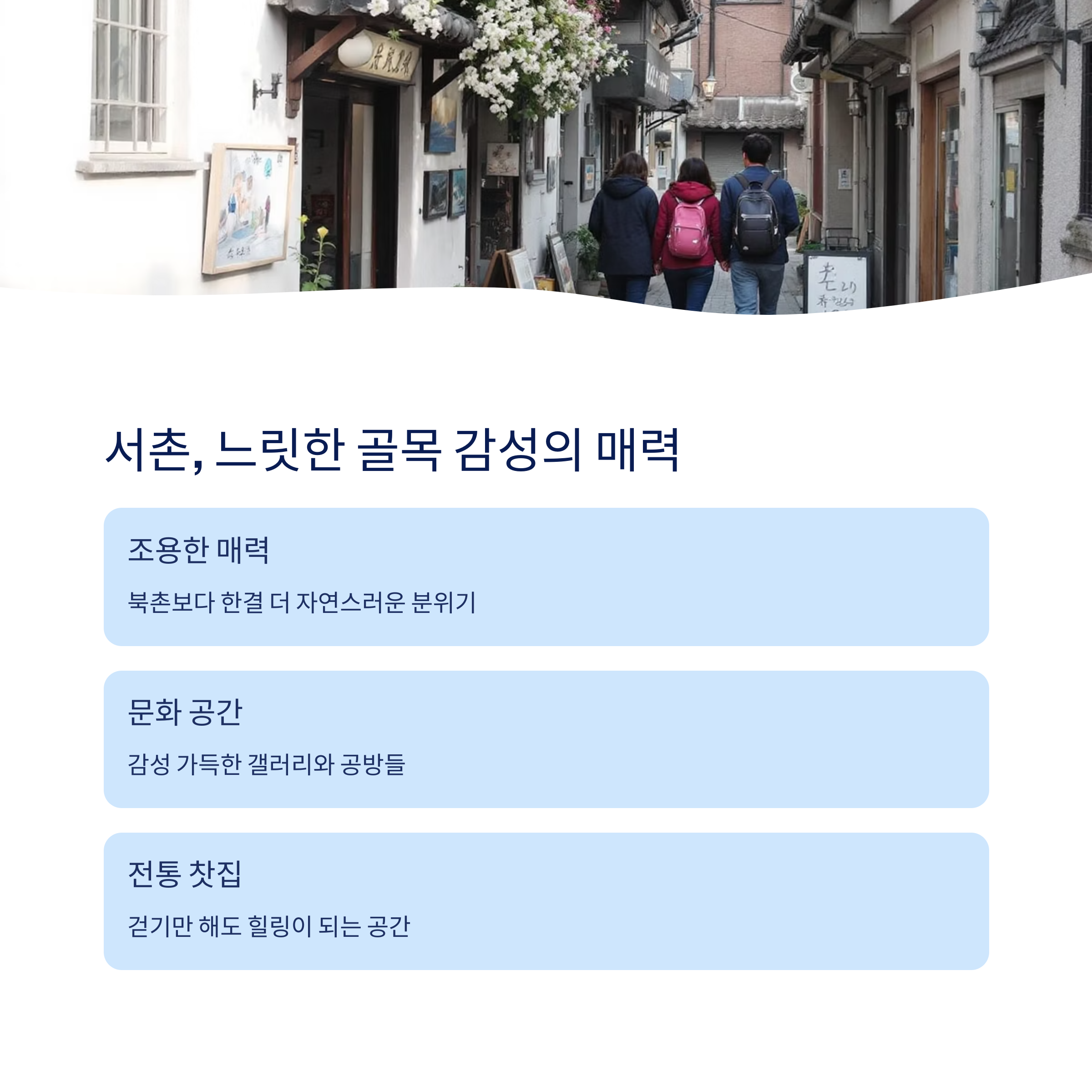 | 서촌 | 조용함, 정취 | 예술적 골목 풍경 |