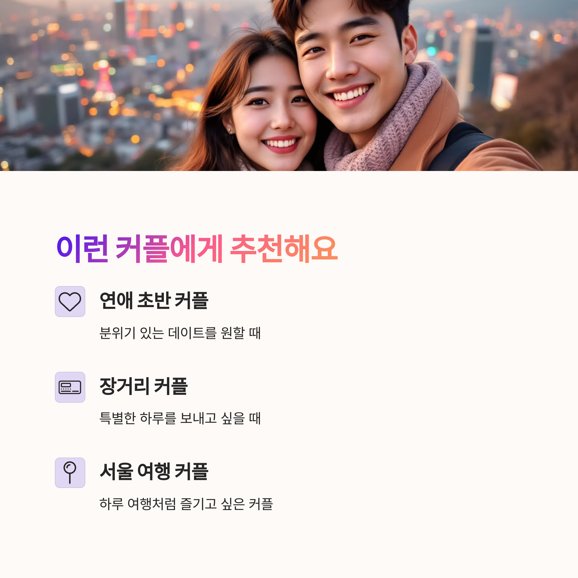 서울에서 하루 여행처럼 즐기고 싶은 커플에게 추천되는 코스입니다