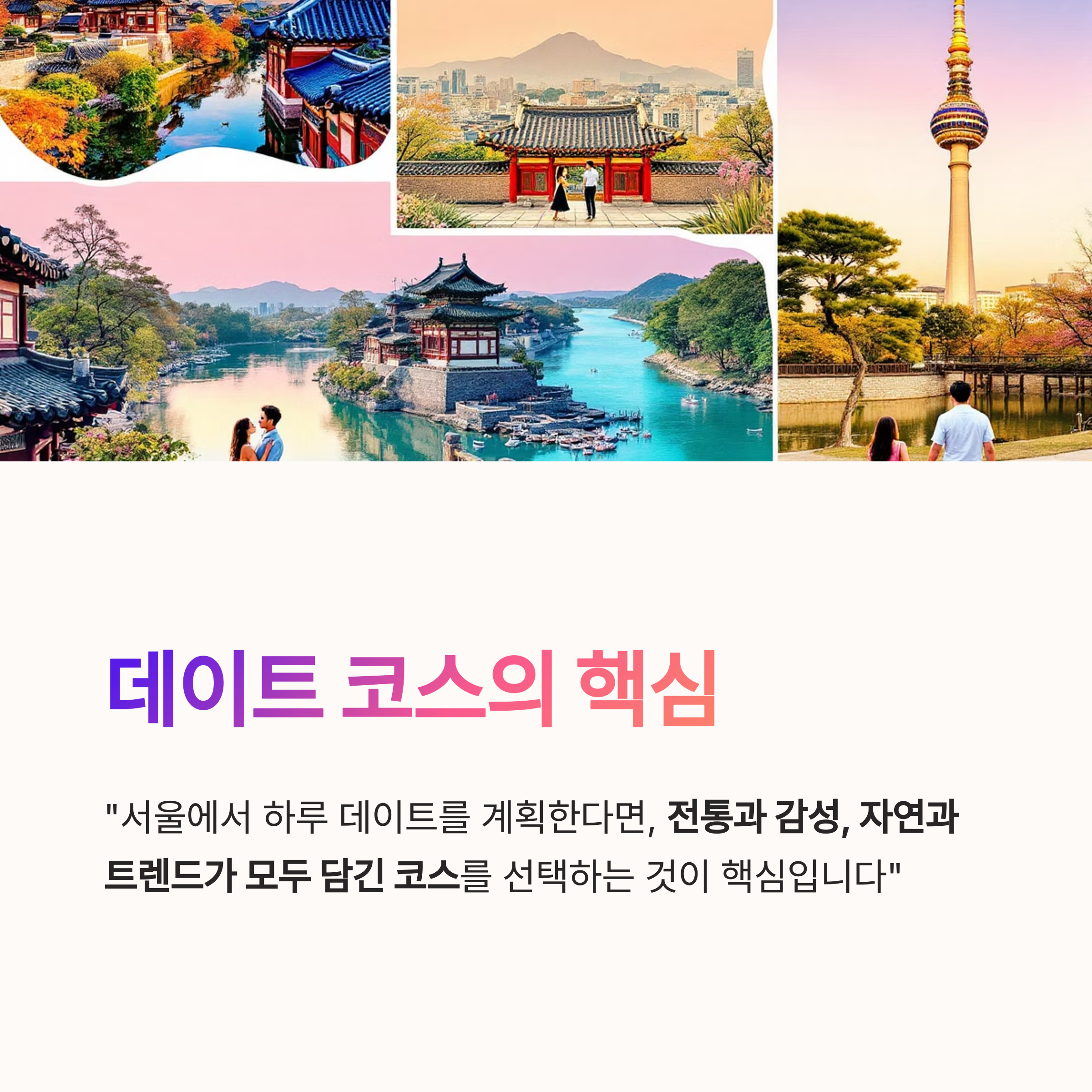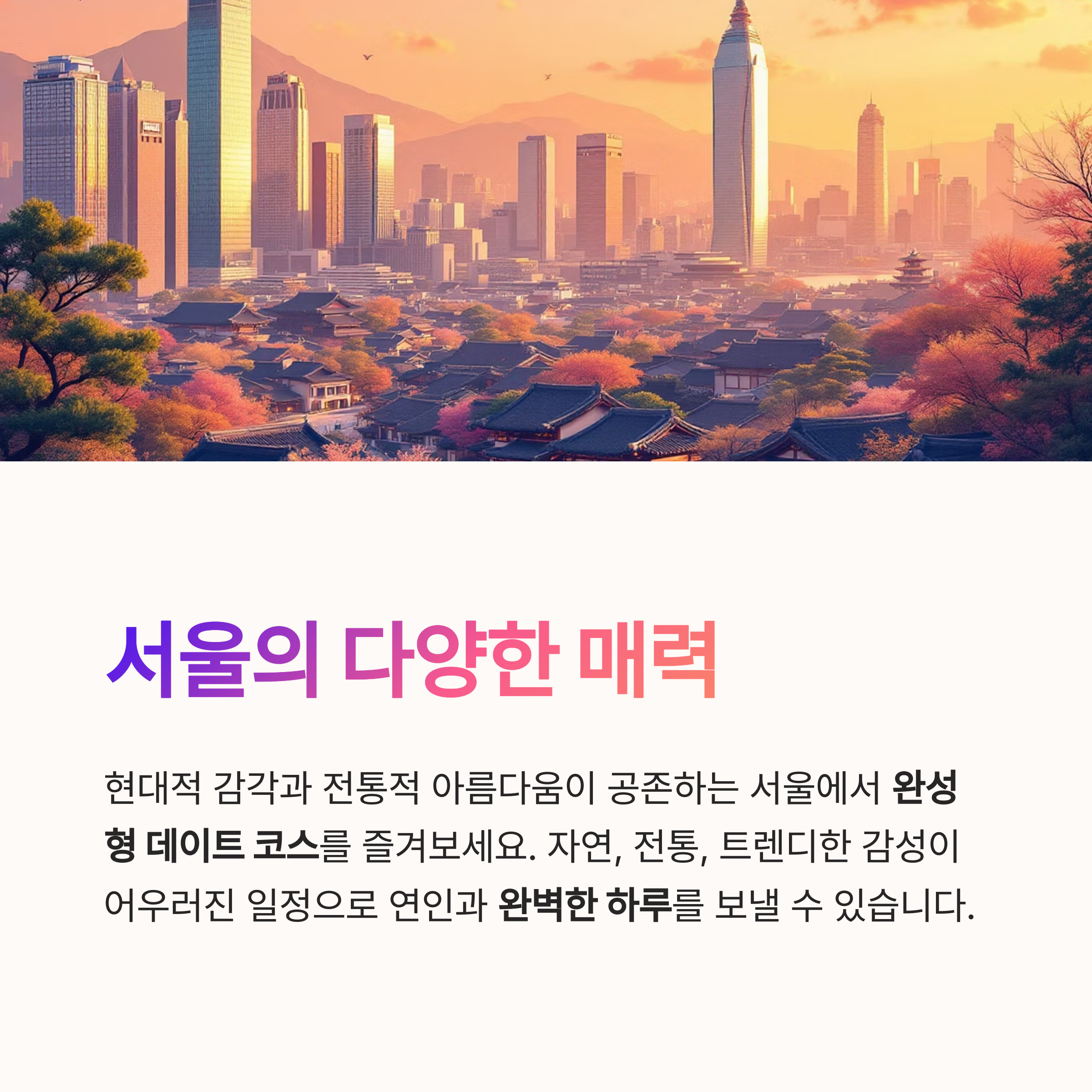 "서울에서 하루 데이트를 계획한다면, 전통과 감성, 자연과 트렌드가 모두 담긴 코스를 선택하는 것이 핵심입니다"