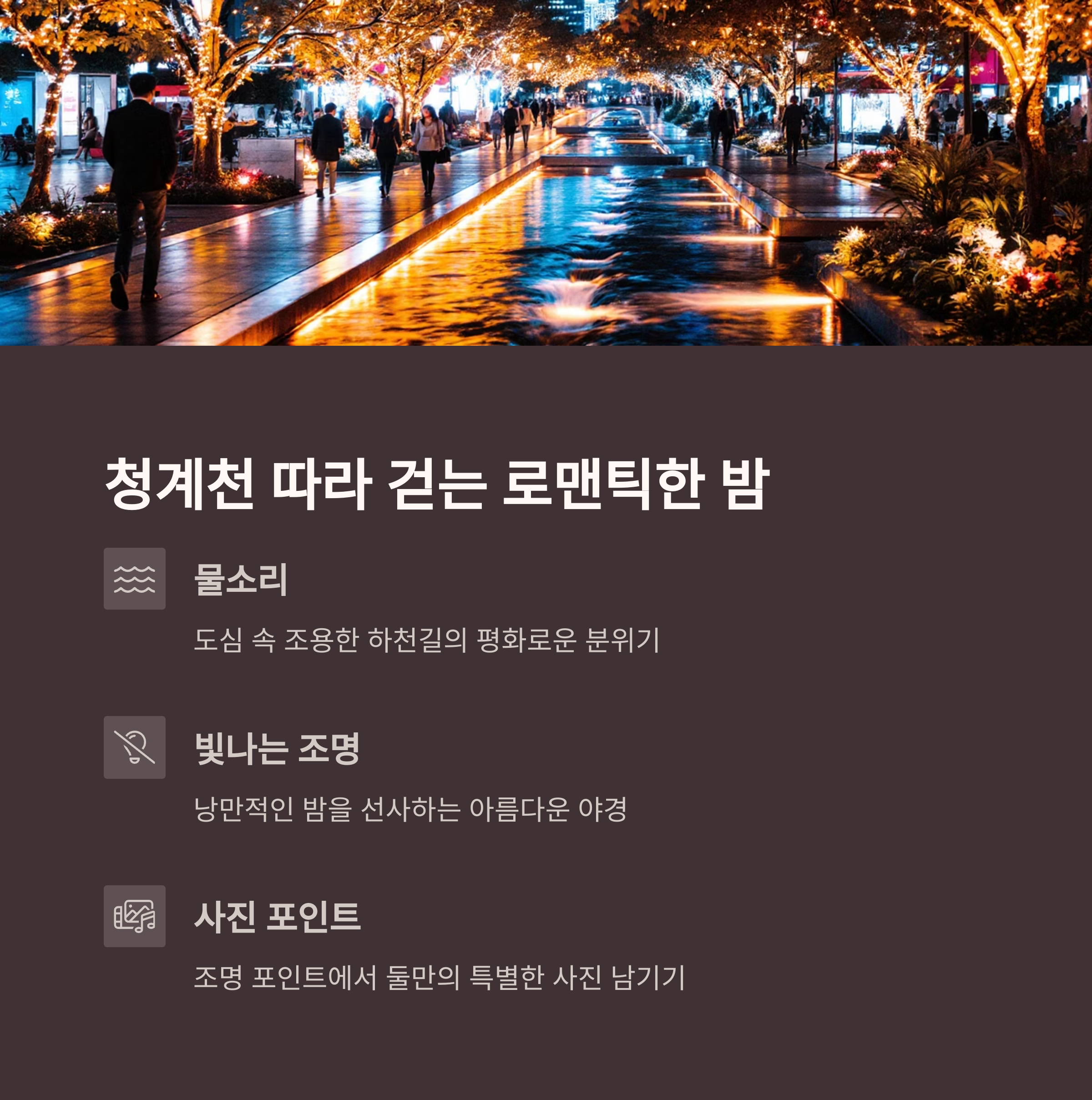 | 밤 | 청계천 | 도심 속 산책, 로맨틱 야경 |