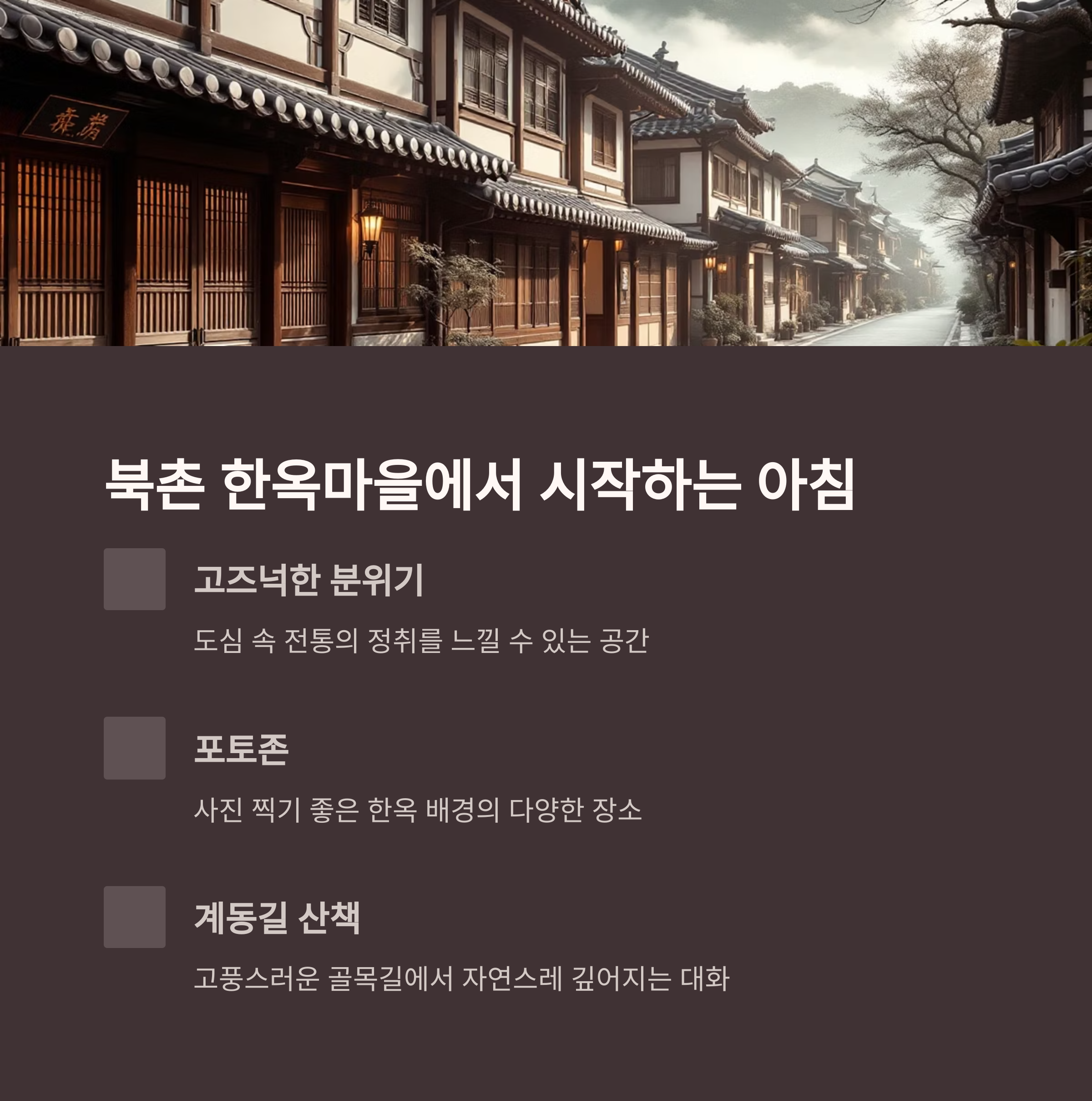 | 오전 | 북촌 한옥마을 | 고즈넉한 분위기, 한옥 골목 산책 |