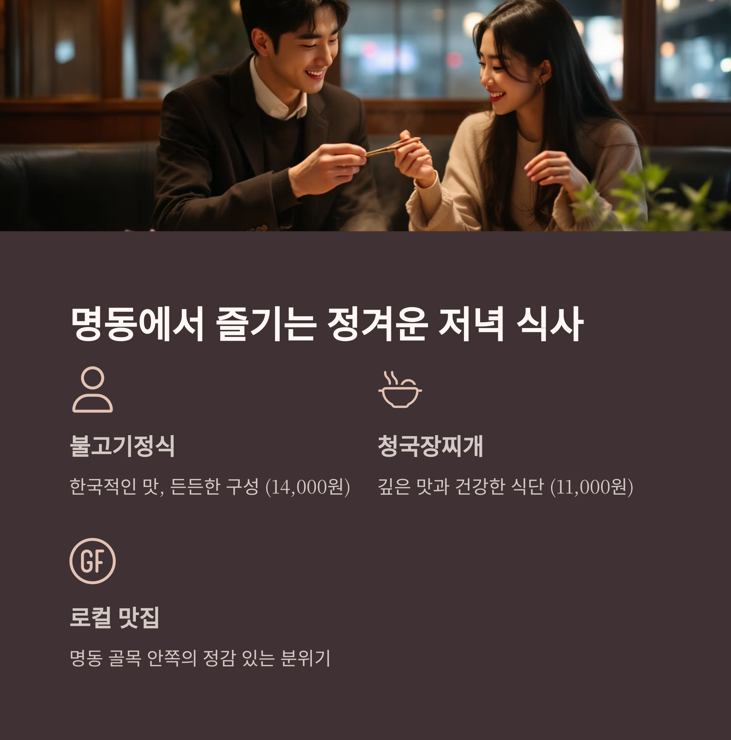 | 저녁 | 명동 맛집 | 따뜻한 한식, 편안한 분위기 |
