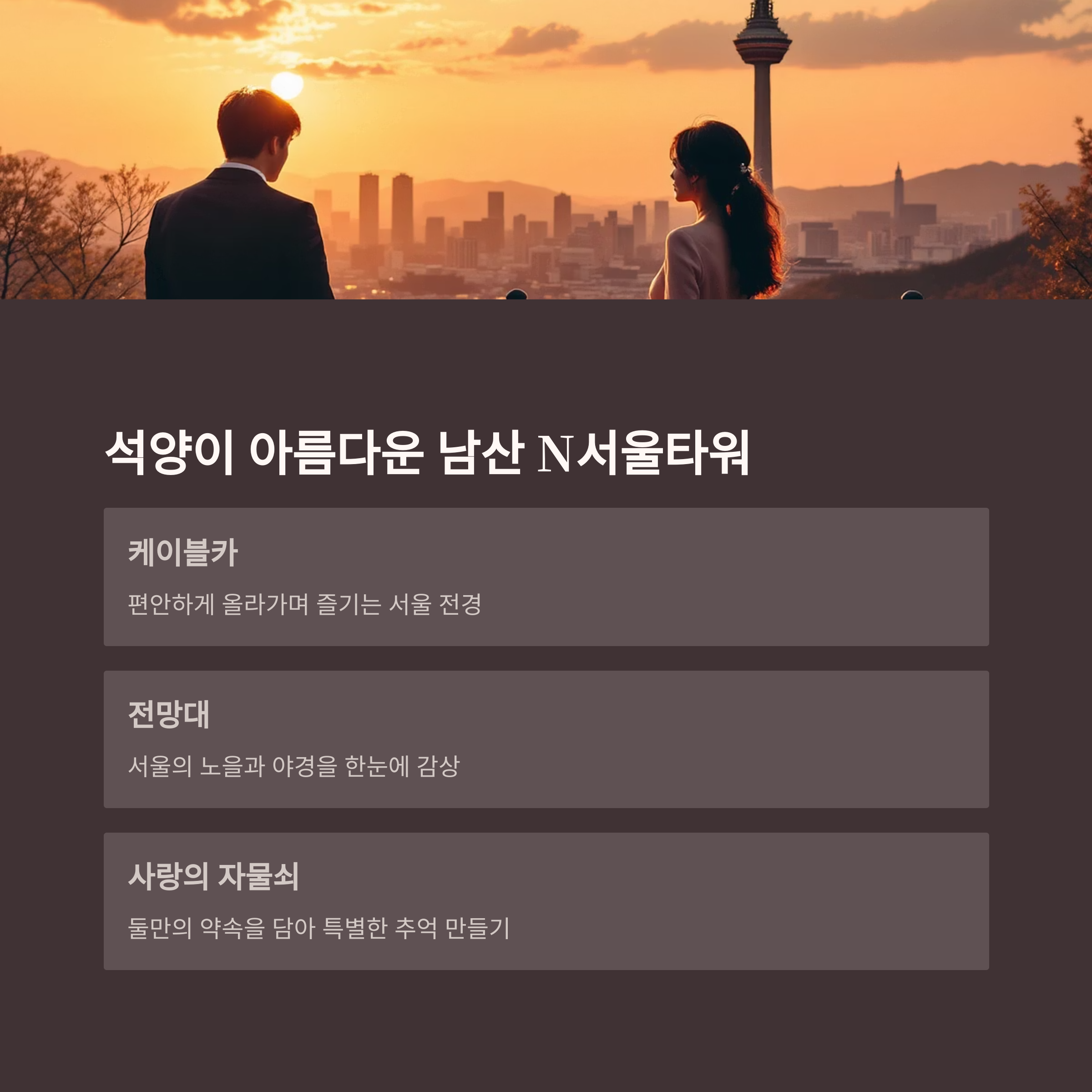| 석양 무렵 | 남산타워 | 전망대, 사랑의 자물쇠 |