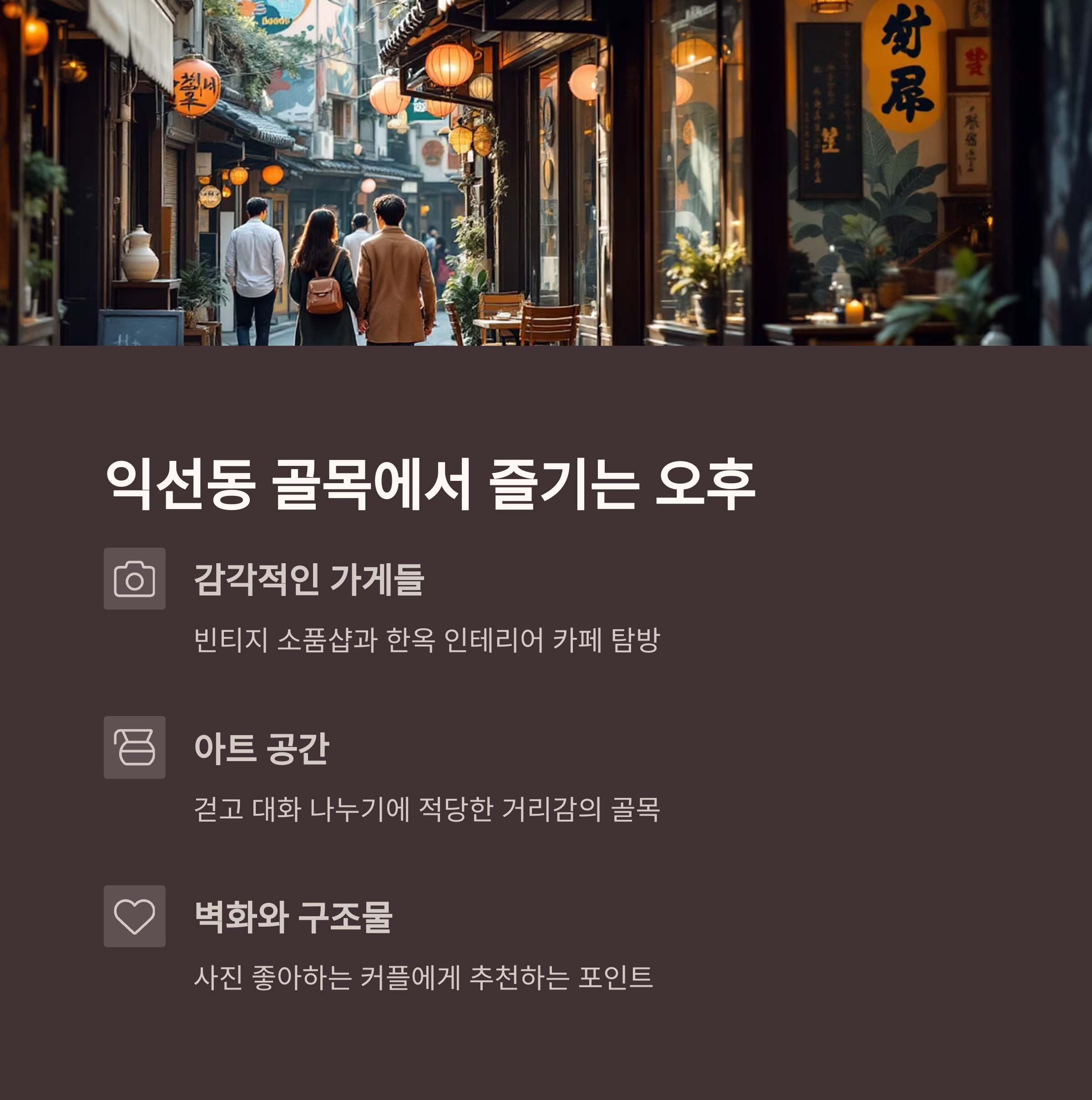 고풍스러운 골목길을 함께 걸으면 자연스레 대화도 깊어집니다.