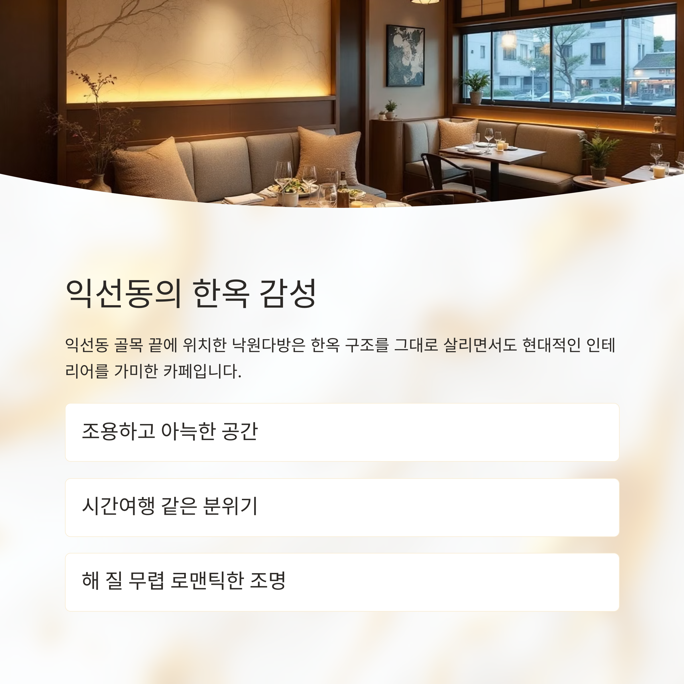 한옥 구조를 그대로 살리면서도 현대적인 인테리어를 가미한 카페입니다.